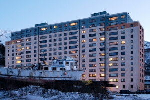 Orașul Whittier din statul american Alaska i-a reunit pe aproape toți rezidenții în aceeași clădire cunoscută sub numele de Begich Towers. Este un bloc cu 14 etaje, în care funcționează și o clinică, secția de poliție și un magazin.
