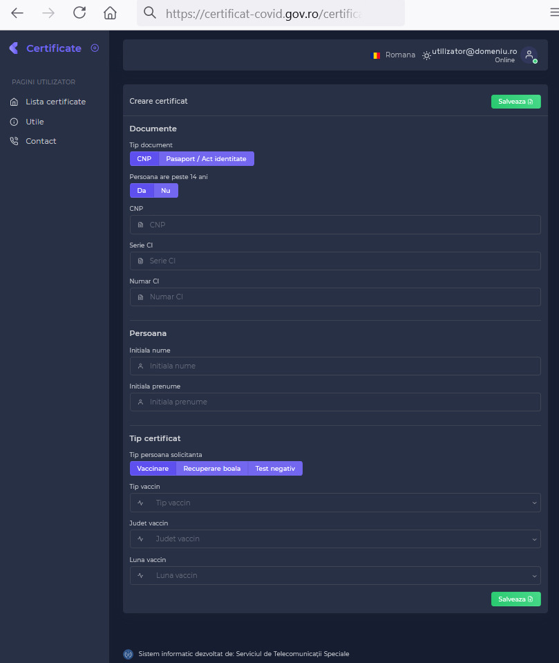 Cei care vor dori un certificat pentru a călători în siguranță pe timpul pandemiei de COVID-19 vor avea la dispoziție, începând de joi, platforma https://certificat-covid.gov.ro. Interfața aplicației este intuitivă, iar în mai puțin de 10 pași, poate fi obținut certificatul:
