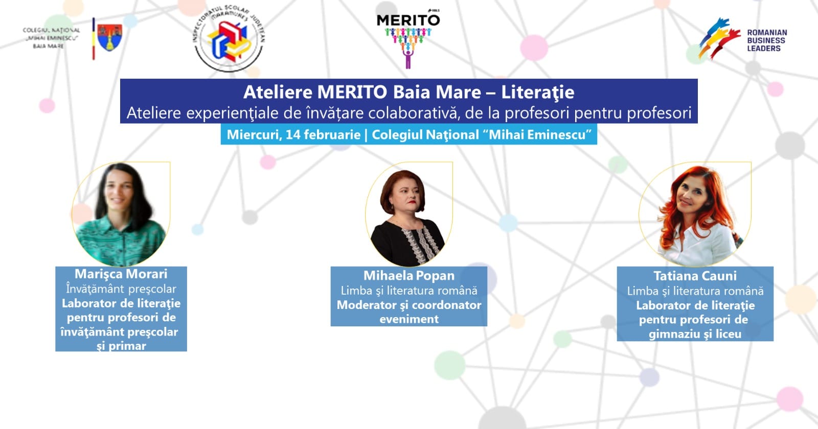 Miercuri, 14 februarie, de la ora 14.30, la Colegiul Național „Mihai Eminescu” din Baia Mare se vor desfășura un nou Atelier MERITO de literație, pentru învățământul preșcolar și pentru profesori de limba și literatura română (gimnaziu și liceu).