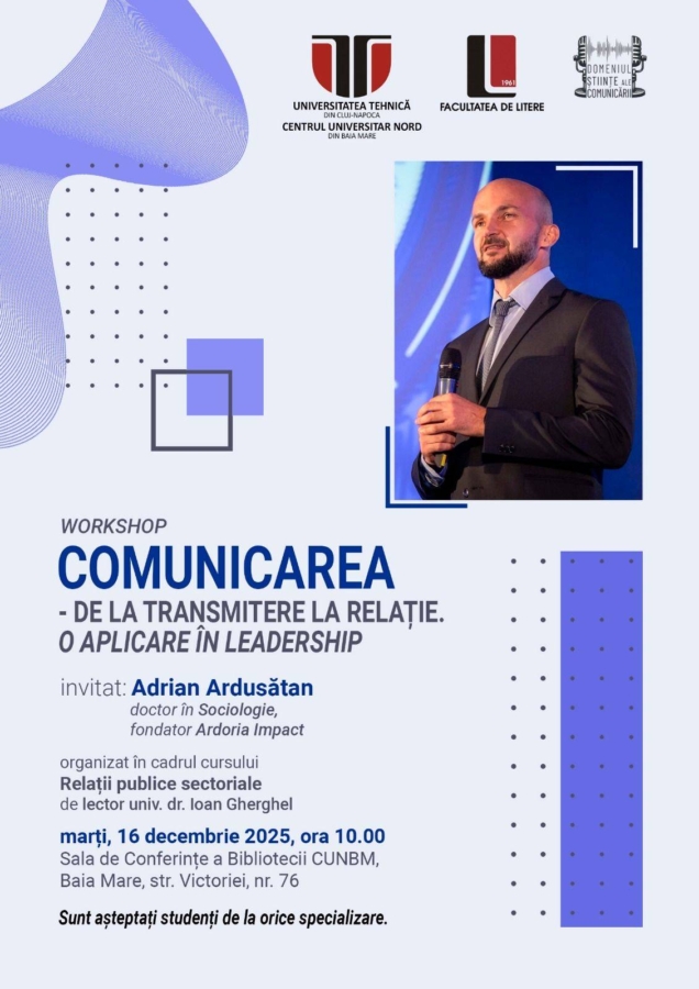 Centrul Universitar Nord din Baia Mare, în colaborare cu Facultatea de Litere a Universității Tehnice din Cluj-Napoca, organizează marți, 16 decembrie 2025, la ora 10:00, în Sala de Conferințe a Bibliotecii CUNBM, workshop-ul „Comunicarea – de la transmitere la relație. O aplicare în leadership”. Evenimentul face parte din cursul Relații publice sectoriale, coordonat de lector universitar dr. Ioan Gherghel, și se adresează studenților de la orice specializare.