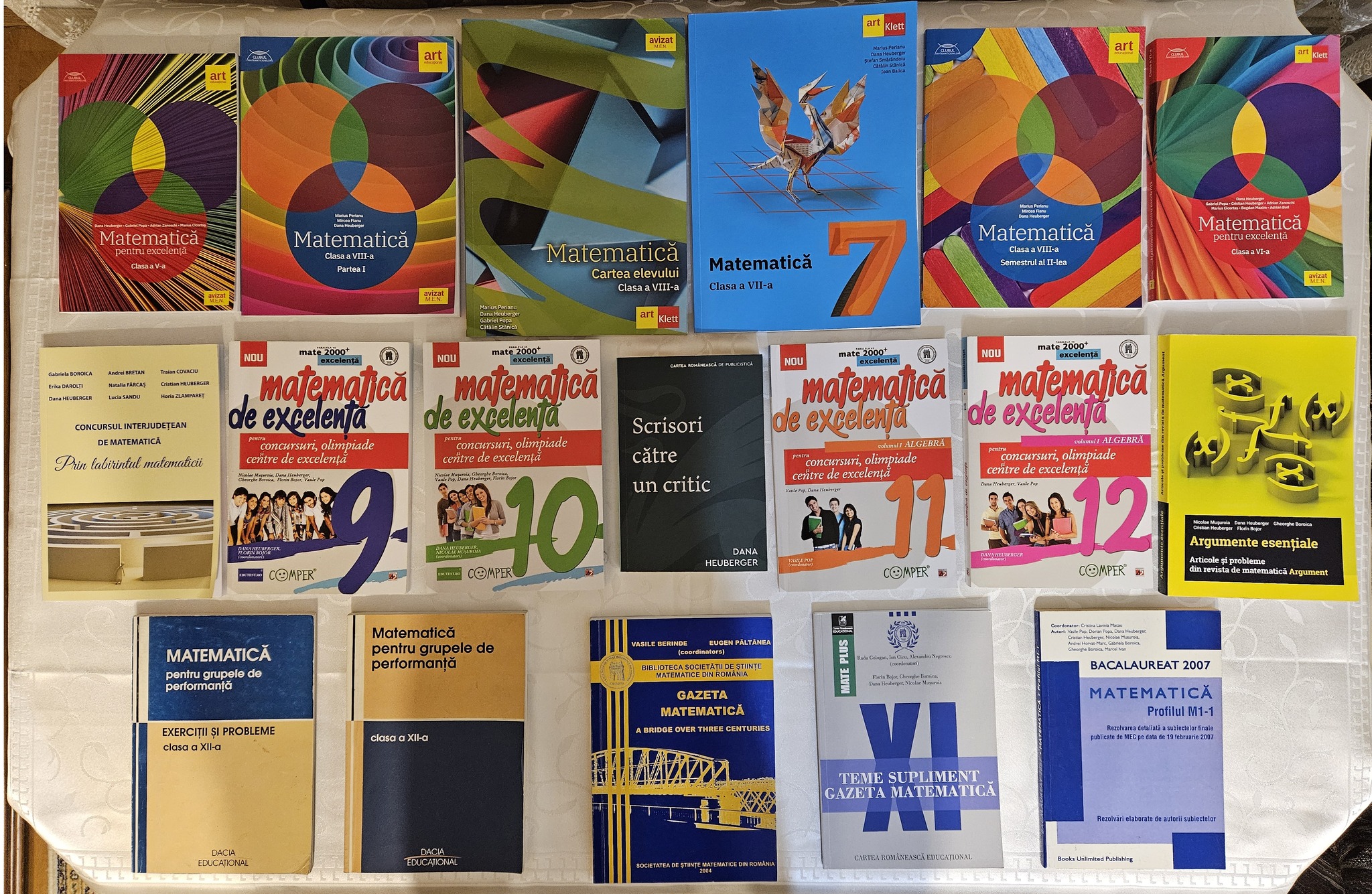 „Nu știu ce mi-a venit, dar azi am întins această „față de masă” mai puțin obișnuită, cu cele mai dragi cărți la care am contribuit până acum. Cărțile de matematică sunt de la clasa a cincea și până la clasa a douăsprezecea, la toate clasele – de la culegeri pentru examene, la volume pentru pregătirea concursurilor școlare (cele de pe rândul de sus au apărut în ultimii patru ani). Iar la cartea mea de eseuri – unica reprezentantă (de până acum) a jumătății mele… nematematice (și singura la care sunt doar eu pe copertă) – țin la fel de mult ca la început.