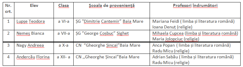 - Bernadette Ingrid Gaspar, clasa a IX-a, Liceul Teoretic ”Petru Rareș” Tg. Lăpuș;