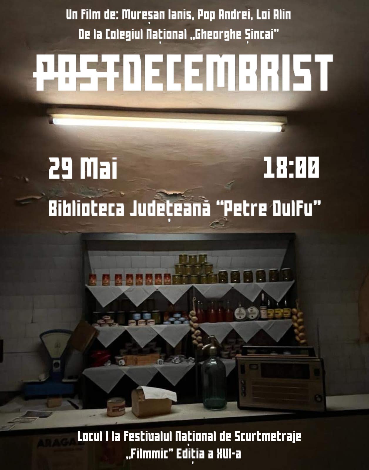 Vă invităm să le fiți alături miercuri, 29 mai 2024, începând cu ora 18.00, la Biblioteca Județeană “Petre Dulfu” Baia Mare, unde va avea loc proiecția scurtmetrajului “Postdecembrist”!”, transmite prof. Adriana Meșter.