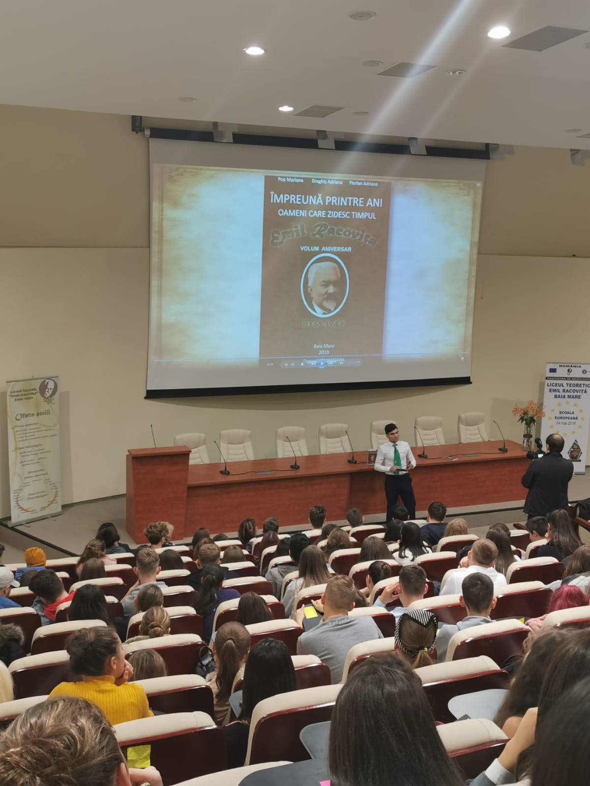 Vineri, 15 noiembrie, a avut loc lansarea volumului aniversar ”Oameni care zidesc timpul”, care conține 100 de eseuri scrise de elevi ai Liceului Teoretic „Emil Racoviţă” Baia Mare. Aceasta s-a desfăşurat simultan în şase locuri diferite: Muzeul de Etnografie și Artă Populară (activitate coordonată de prof. Corina Onţiu), Colonia Pictorilor (prof. Raluca Giurgiulescu), Planetariu (prof. Mihaela Breban), Biblioteca Județeana „Petre Dulfu” (prof. Tatiana Cauni), Centrul Universitar Nord (prof. Adriana Draghiş), Biblioteca Centrului Universitar Nord (prof. Anca Constantinescu). Evenimentul a fost parte a proiectului instituțional „Împreună printre ani – (De)Venind… în timp”, derulat la liceul băimărean.
