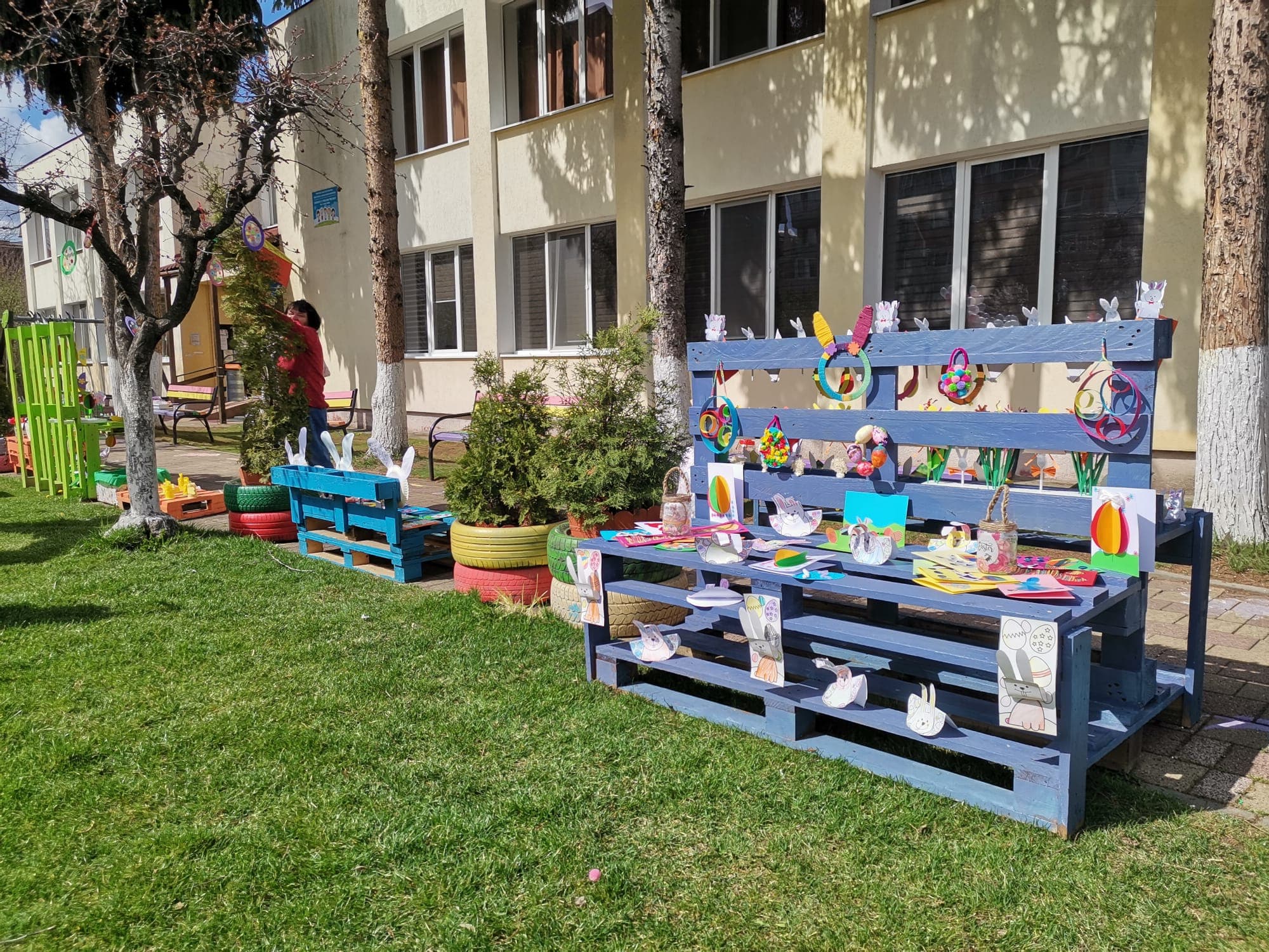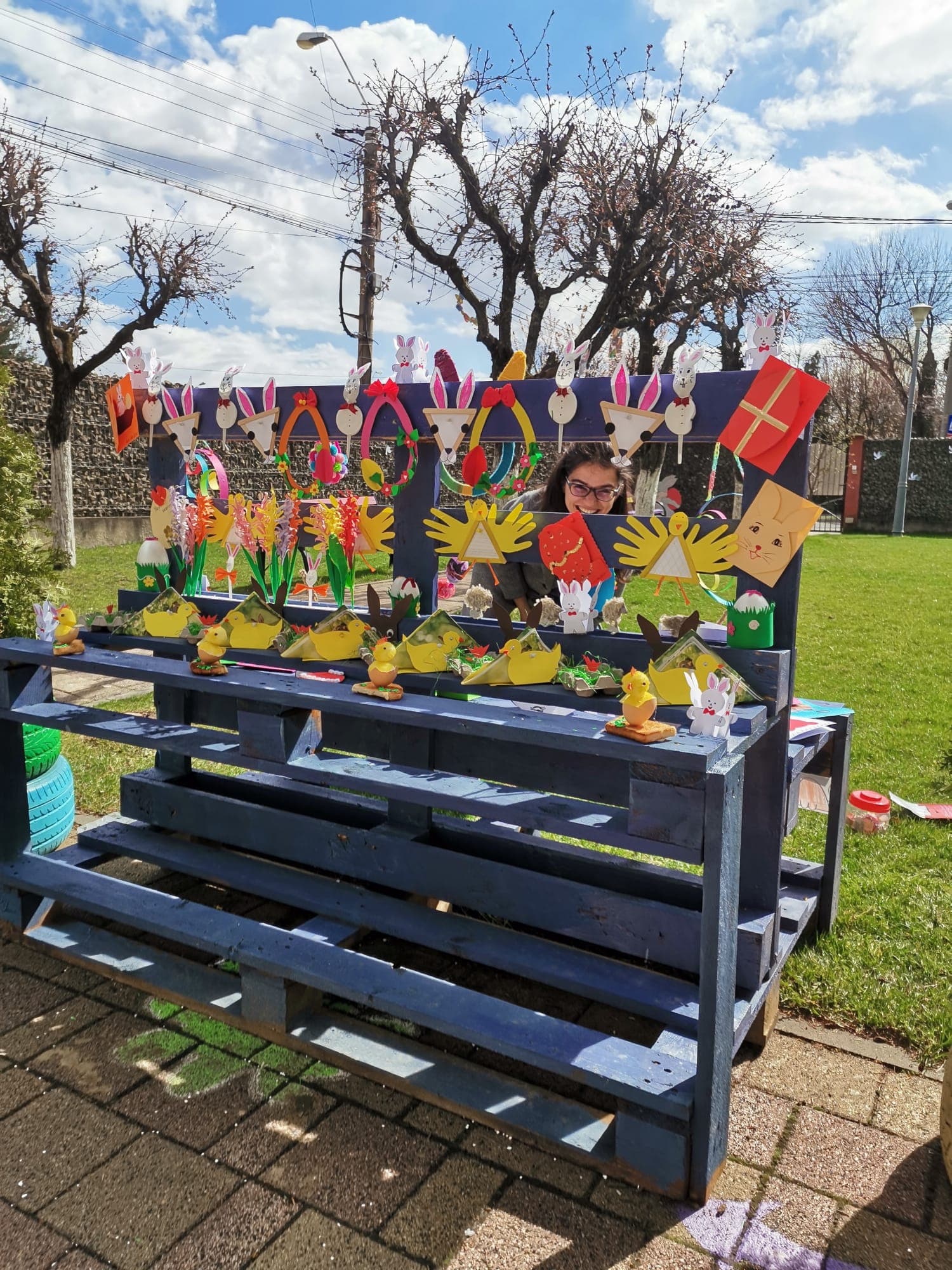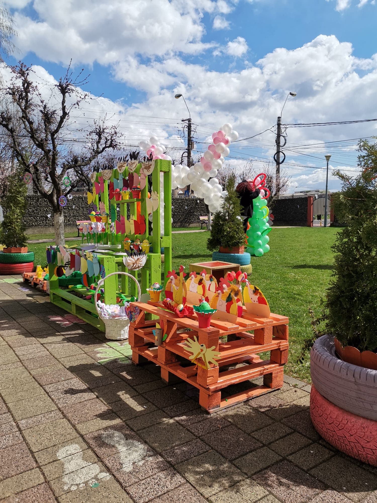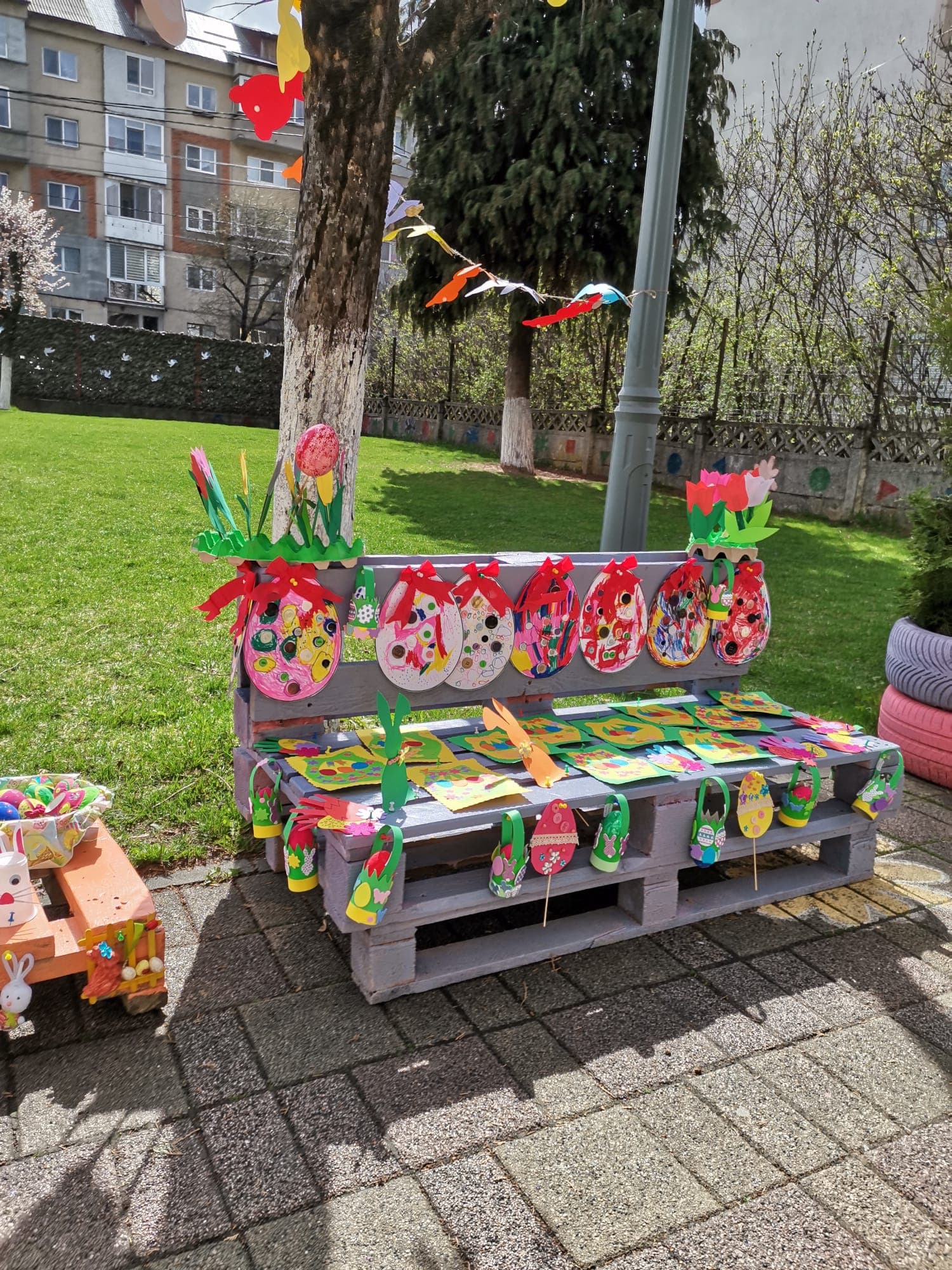 În semn de mulțumire pentru copii, dar și pentru părinți, cadrele didactice le-au pregătit o surpriză: au animat spațiul verde al grădiniței cu diverse decorațiuni de Paște. Acestea sunt îndrăgite de copii și aduc un plus de valoare întregii expoziții.
