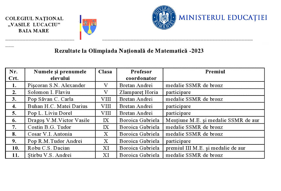 Din cei 22 de elevi care au reprezentat județul Maramureș la etapa națională, 11 sunt de la Colegiul Național „Vasile Lucaciu” din Baia Mare. Aceștia s-au reîntors acasă cu rezultate deosebite.