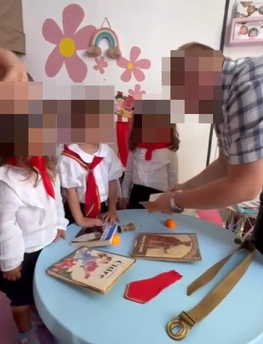 Preșcolarii au fost îmbrăcați în uniforme de pionieri și șoimii patriei, apoi au recitat saluturi comuniste