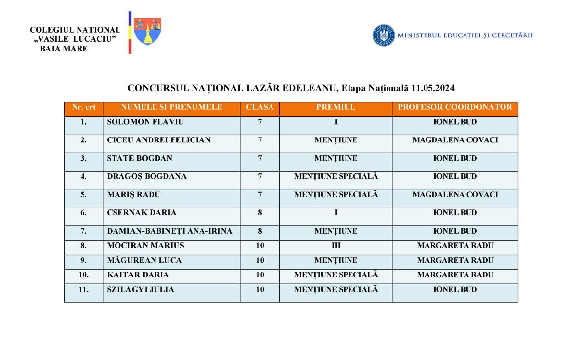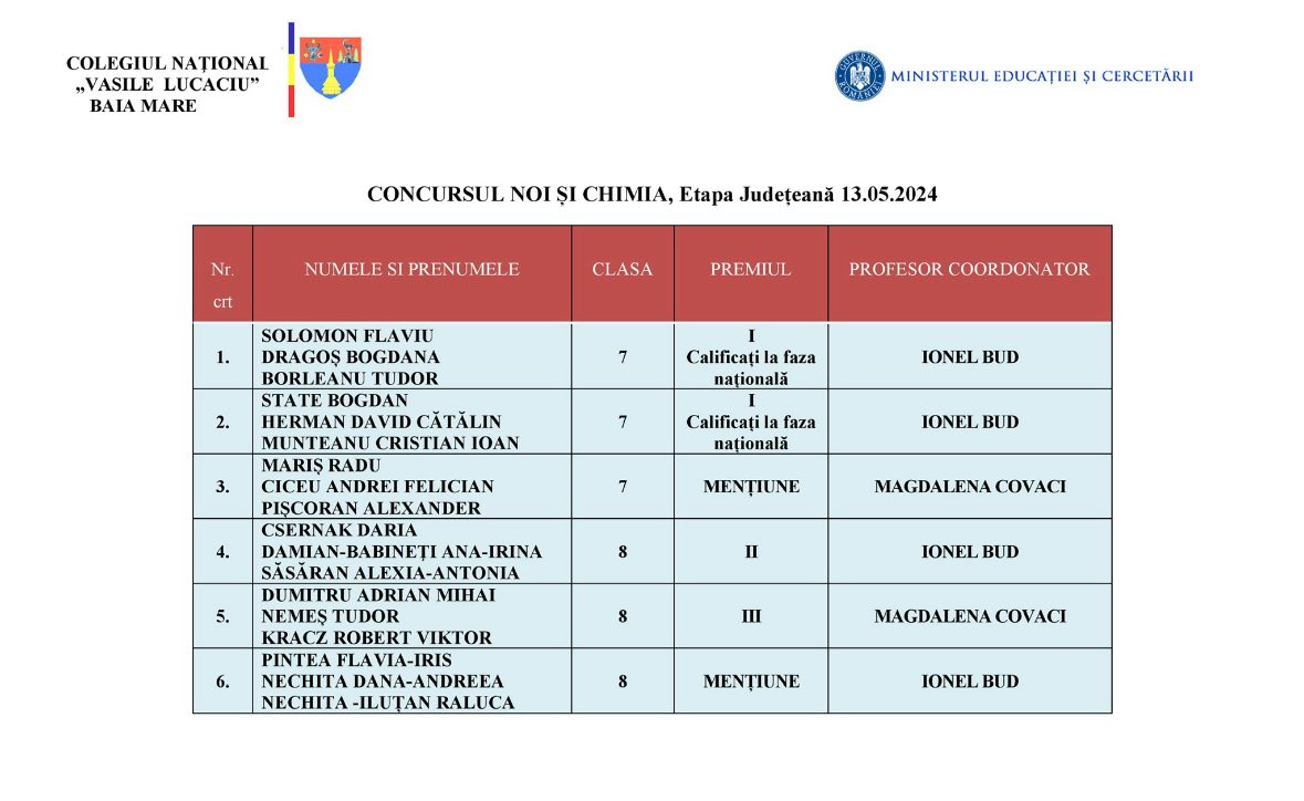Zilele trecute, elevii Colegiului Național „Vasile Lucaciu” din Baia Mare au obținut rezultate remarcabile la două concursuri de chimie: Concursul Național “Lazăr Edeleanu” – faza națională și Concursul ,,Noi și Chimia” – faza județeană, consolidând astfel renumele instituției ca unul dintre cele mai bune licee din Maramureș în domeniul științelor exacte.