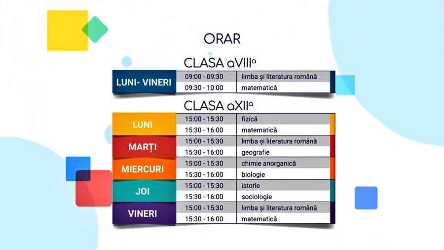 În această a doua săptămână de ore televizate, structura pregătirii pentru clasa a VIII-a rămâne aceeași, iar la clasa a XII-a apar orele de chimie, fizică, sociologie. Iată programul pentru săptămâna 23-27 martie: