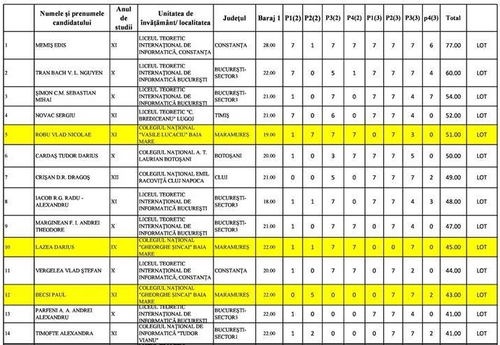 - Paul Becsi, clasa a XI-a, Colegiul Naţional “Gheorghe Şincai” Baia Mare, profesor îndrumător Florin Bojor – medalie de argint, menţiune MEN; loc 12 la barajul intermediar.