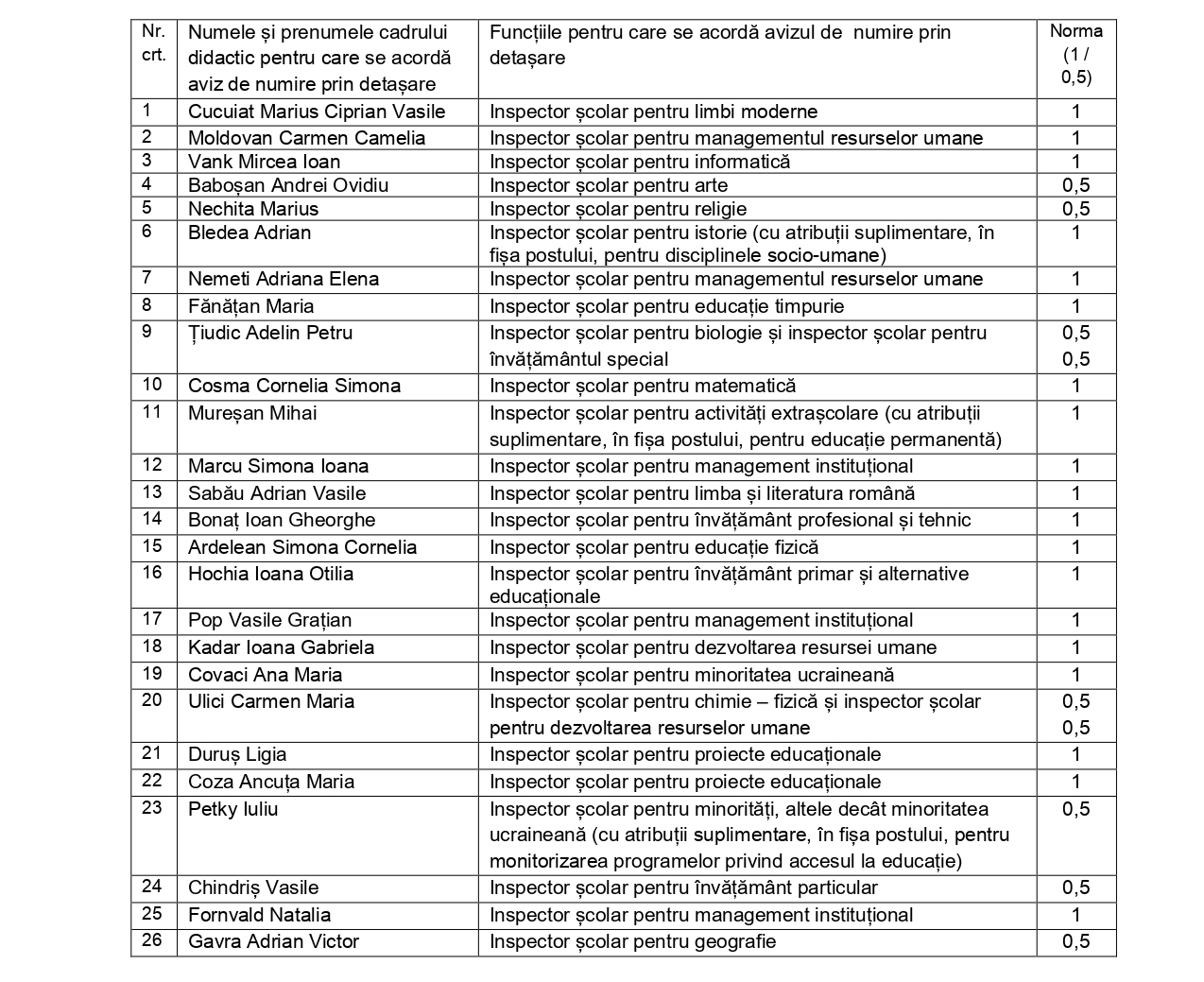 În conformitate cu prevederile adreselor Ministrului Educației nr. 2795/DGMRURS/29.08.2024, au fost numiți, prin detașare în interesului învățământului, pe posturile vacante aferente funcțiilor de inspector școlar, începând cu data de 1 septembrie 2024, până la organizarea concursului de către Inspectoratul Școlar Județean Maramureș, dar nu mai târziu de sfârșitul anului școlar 2024-2025, următoarele cadre didactice: