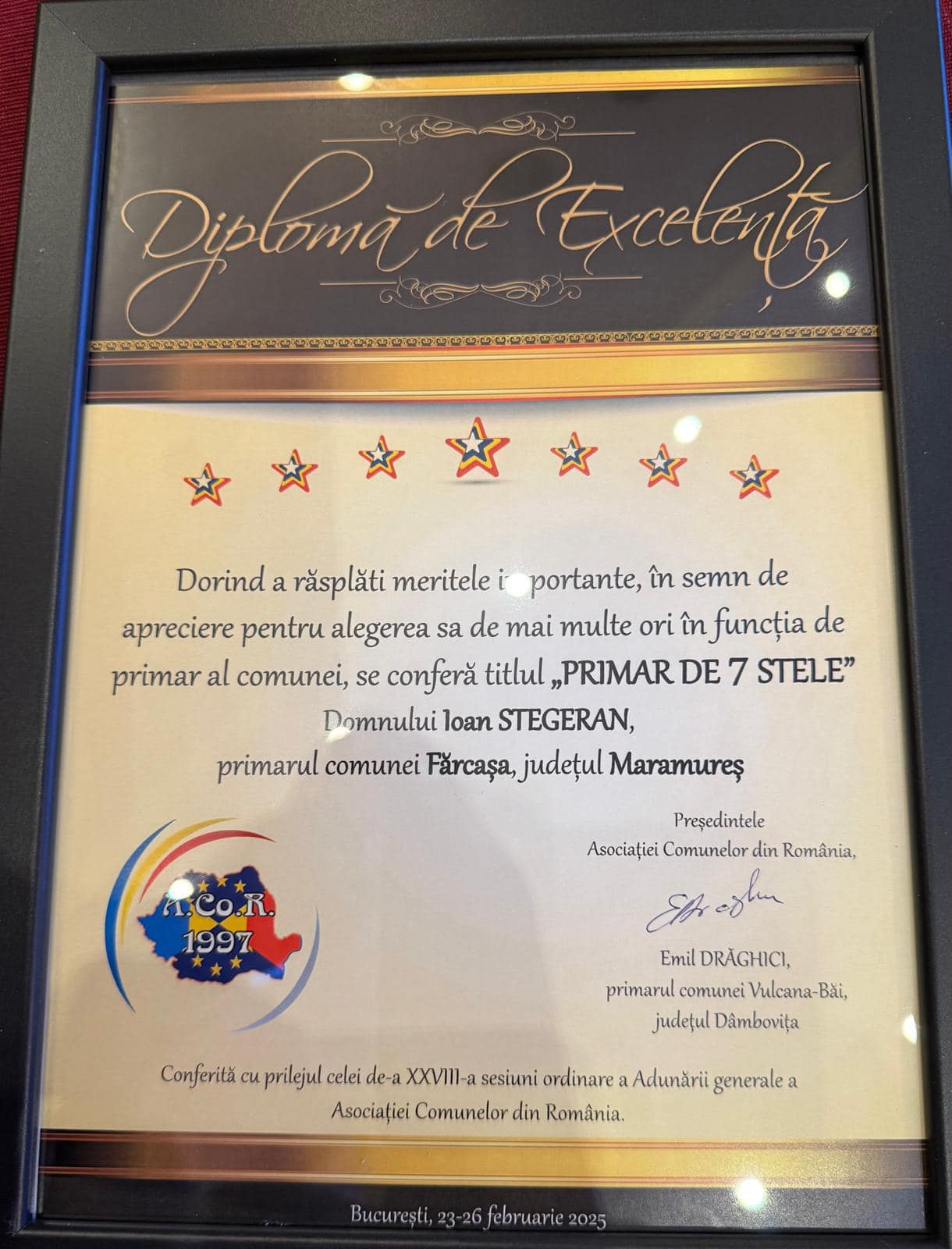 Ioan Stegeran, primarul comunei Fărcașa, a primit distincția „Primar de 7 stele”
