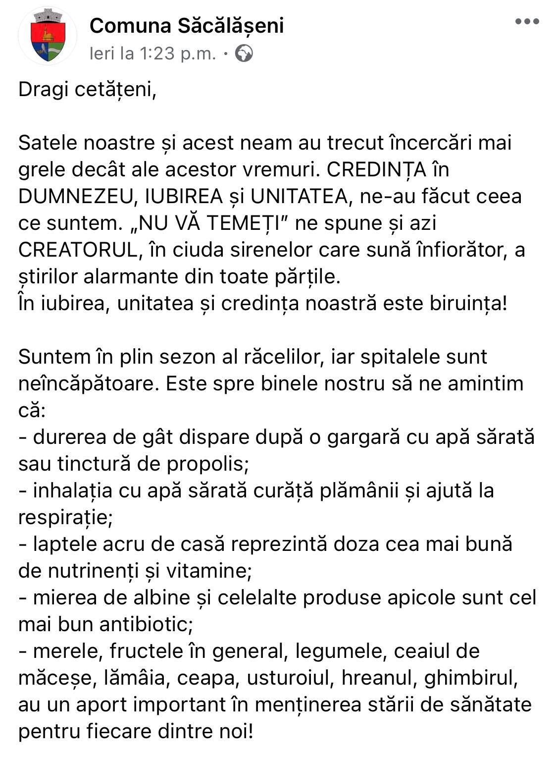 După ce s-a trezit într-o lume nouă, iar postarea făcută în numele primăriei, nu în nume personal, și a ajuns în atenția celor din țară, primarul de la Săcălășeni a realizat că lumea s-a mai schimbat și nu orice debitezi mai trebuie și luat în considerare.