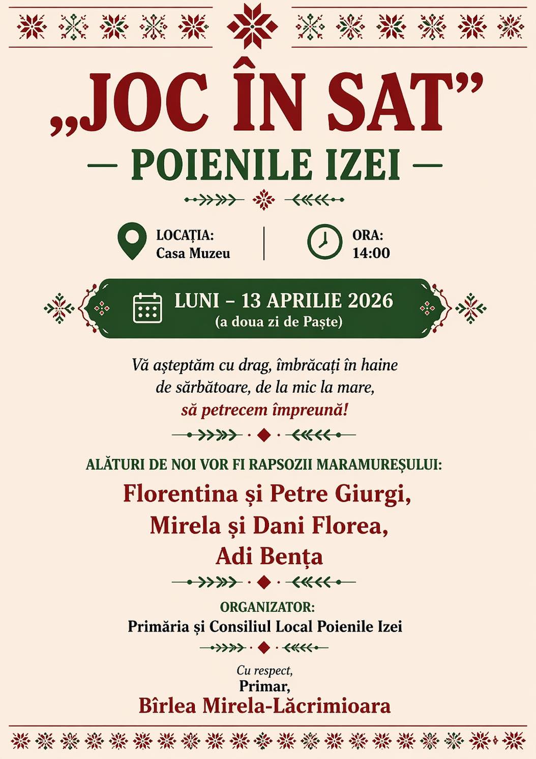 Luni, 13 aprilie, a doua zi de Paști, în Poienile Izei va avea loc evenimentul „Joc în Sat”. Evenimentul va debuta la ora 14.00, la Casa Muzeu.