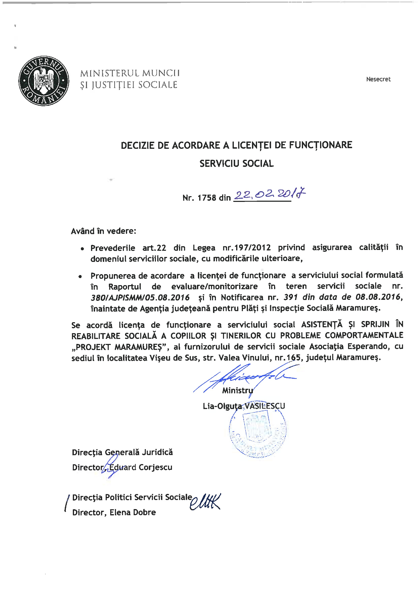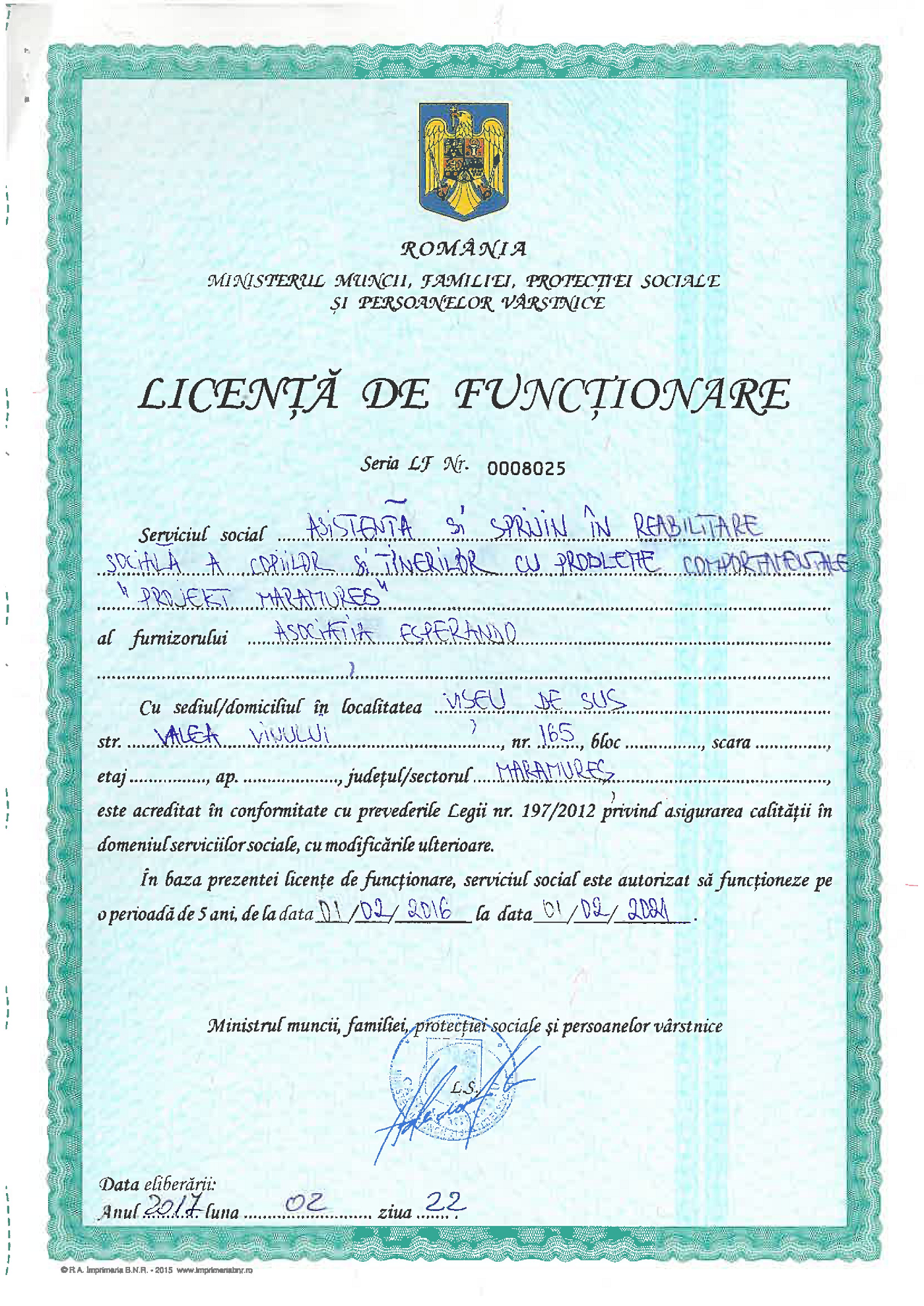 O reacție oficială a venit și de la ministrul Muncii, Marius Budăi, care a dispus corpului său de control să facă o verificare la fața locului și la Agenţia Judeţeană pentru Plăţi şi Inspecţie Socială (AJPIS) Maramureş. E adevărat că ministerul pe care îl conduce acum Budăi a eliberat Decizia de acordare a licenței de funcționare serviciu social nr. 1758/22.02.2017 și Licența de funcționare seria LT nr. 0008025, valabile până în 01.02.2021 (vezi galeria foto). Dar acestea au fost acordate pe baza Raportului de evaluare/monitorizare în teren servicii sociale nr. 380/AJPISMM/05.08.2016 și Notificarea nr. 391/08.08.2016, întocmite de Agenţia Judeţeană pentru Plăţi şi Inspecţie Socială (AJPIS) Maramureş.