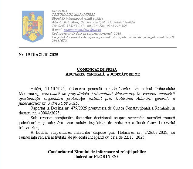 Adunarea Generală a Judecătorilor din cadrul Tribunalului Maramureș a decis, marți, 21 octombrie 2025, suspendarea protestului declanșat la finalul lunii august, urmând ca activitatea de judecată să fie reluată integral începând de miercuri, 22 octombrie.