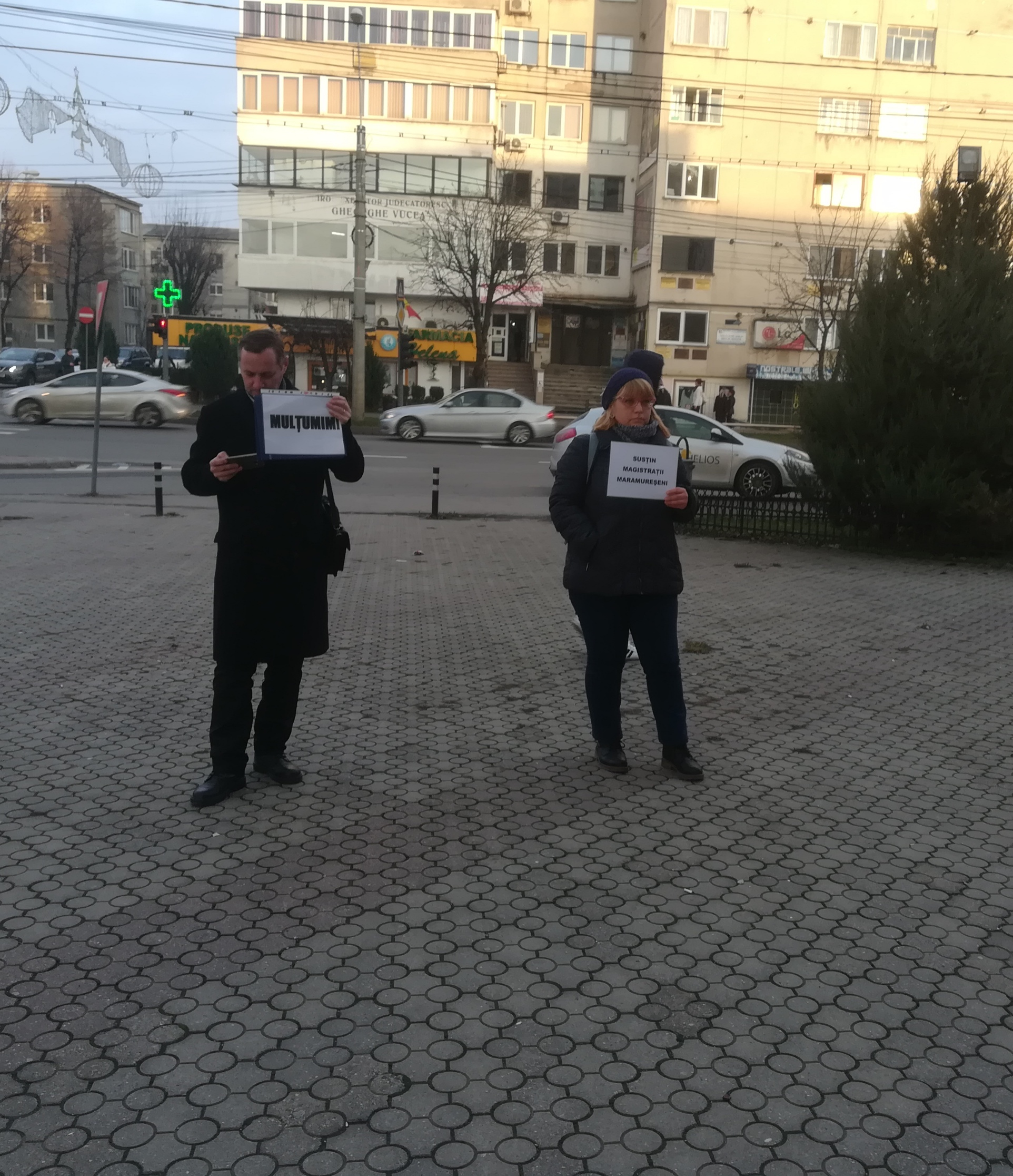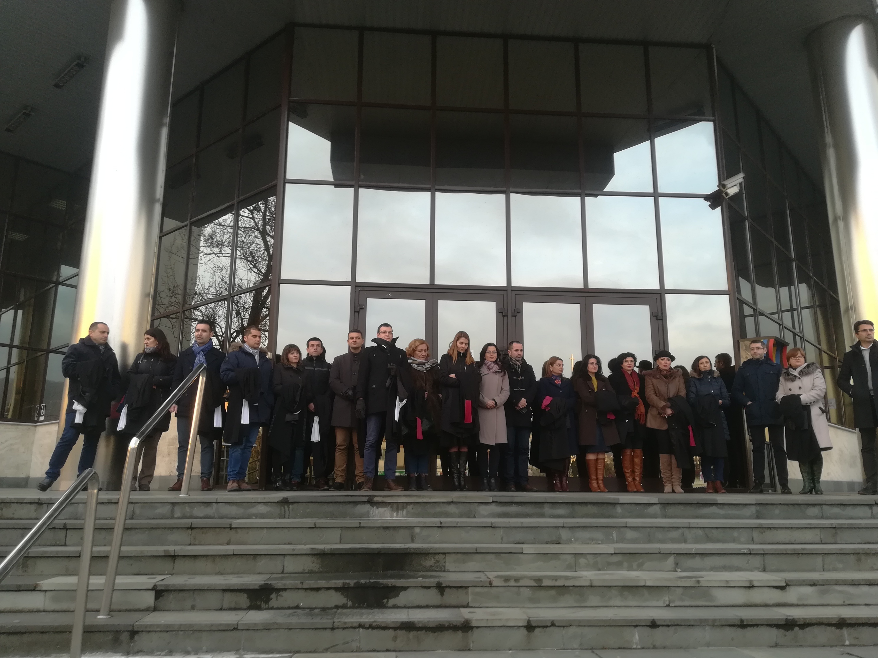 Nici 20 de minute nu a durat protestul judecătorilor de la Tribunalul Maramureș, din fața Palatului Justiției. A fost un protest sobru, tăcut. În loc de pancarte sau banderole, cei 22 de protestatari au purtat pe brațe robele. L-am întrebat pe prim-procurorul adjunct al Parchetului de pe lângă Tribunalul Maramureş, Bogdan Gabor, dacă e un protest generic față de ceea ce înseamnă modificarea Codului penal, a Codului de procedură penală şi a legilor justiţiei sau sunt lucruri punctuale care-i deranjează. ”Nu am protestat față de legile justiției, deși au fost multe lucruri care nu ne-au plăcut, dar am înțeles că asta ținea de o organizare, stabilită de parlament. Însă în coduri au apărut propuneri care lipsesc organele judiciare de instrumente specifice prin care să asigure protecţia victimelor şi identificarea infractorilor. E o chestiune care îngreunează semnificativ realizarea unei justiţii penale eficiente”. Și ca să fie pe înțelesul tuturor, Bogdan Gabor a dat un exemplu simplu de operare după modificările de la codul penal. ”Obținem un mandat de percheziție pentru țigări de contrabandă. Intrăm în casa omului unde avem informații că se află acestea și, la fața locului, găsim și grenade (chiar a fost, cândva, un astfel de caz la Sighet). Nu le putem ridica pentru că nu scrie în mandatul de percheziție. Conform modificărilor, trebuie să deschidem alt dosar pentru grenade, să luăm alt mandat de percheziție pentru ele. Credeți că, atunci când revenim, mai găsim grenadele? Asta aș vrea să înțeleagă opinia publică: faptul că sunt prevederi care pun în pericol siguranța cetățeanului. Și a noastră, până la urmă. De aceea am ieșit la protest, deși nu ne place să apărem în posturi care pot fi penibile!”.