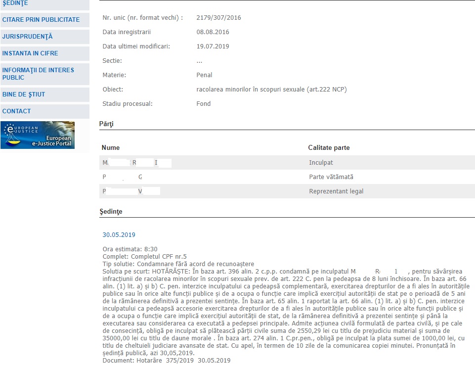 Un muzicant din Sighetul Marmaţiei a fost condamnat – în prima instanță – la opt luni de închisoare pentru racolarea minorilor în scopuri sexuale, pentru că a ademenit o fetiţă în discuţii obscene şi a invitat-o la o întâlnire la care a încercat să întreţină cu ea raporturi sexuale anale.