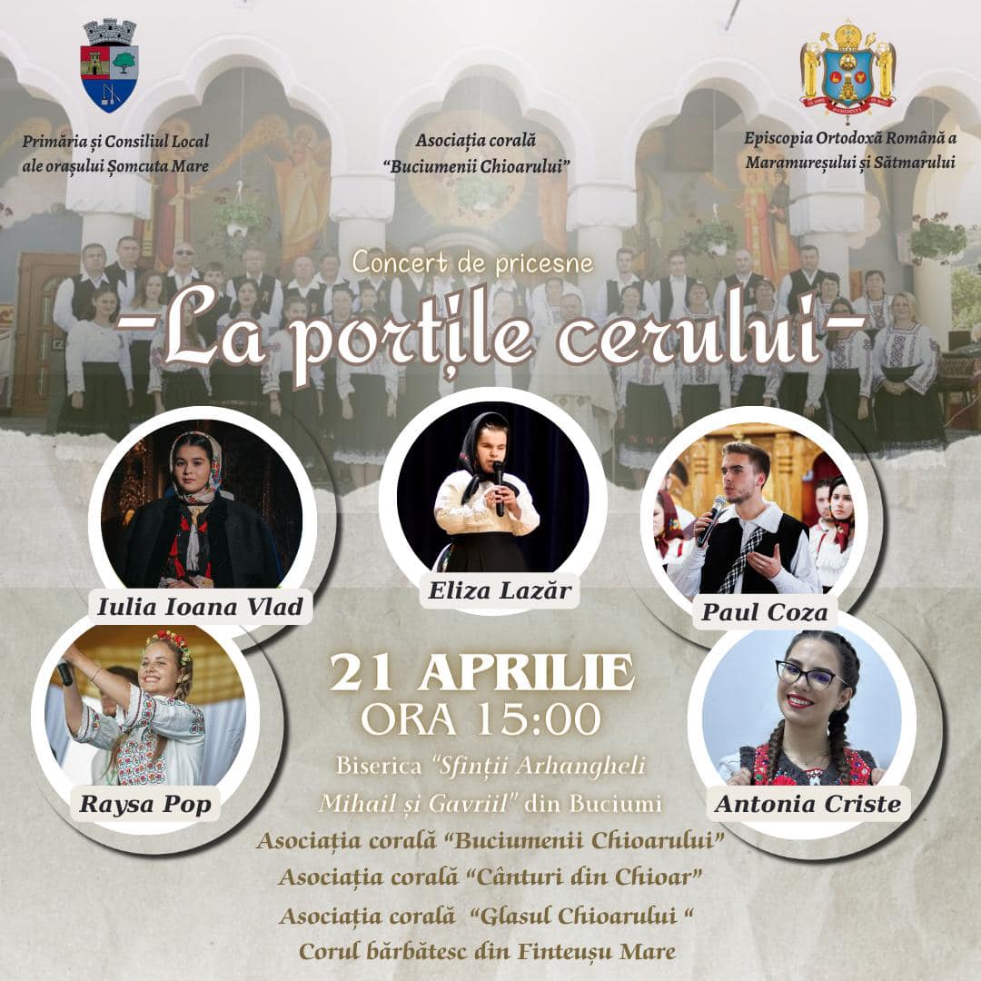 Cu binecuvântarea Preasfințitului Părinte Iustin, Episcopul Maramureșului și Sătmarului, Asociația corală “Buciumenii Chioarului”, Parohia Ortodoxă Română Buciumi și autoritățile locale vă invită la concertul pascal “La porțile cerului”.