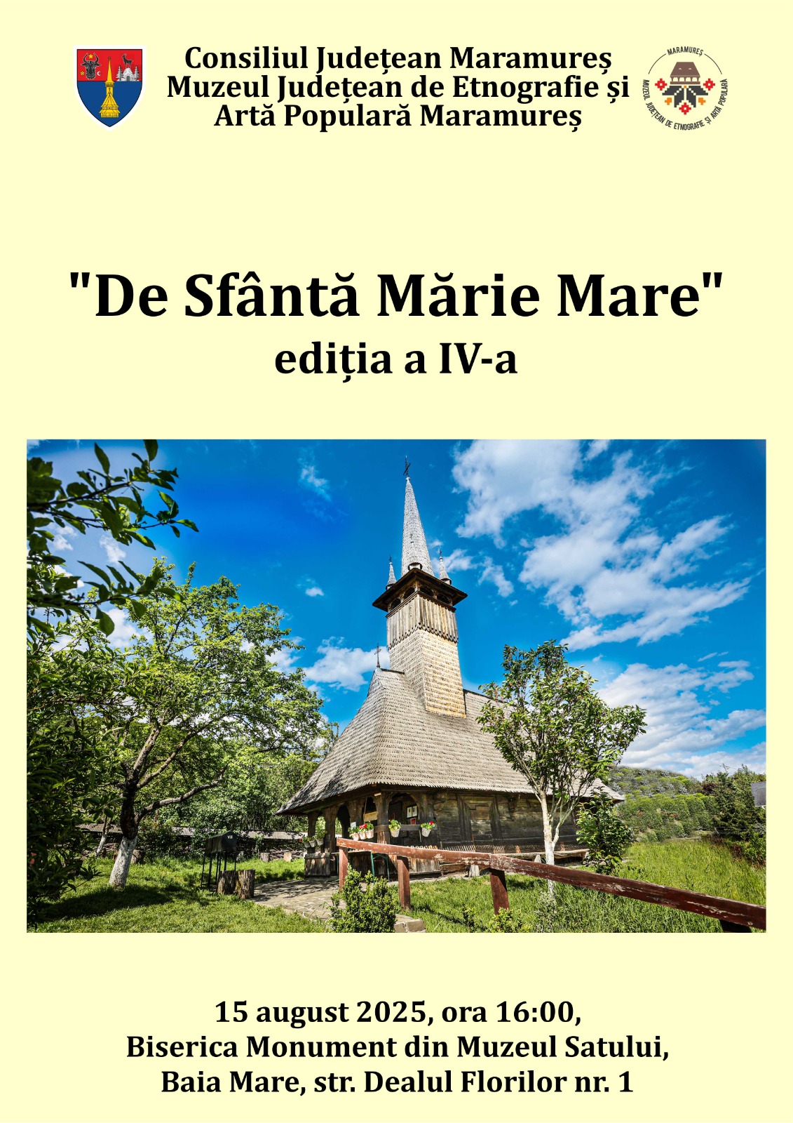 Vineri, 15 august, de la ora 16:00, la biserica de lemn din Muzeul Satului Baia Mate va avea loc Concertul de pricesne „De Sfânta Mărie Mare”, un eveniment dedicat cinstirii praznicului Adormirii Maicii Domnului.