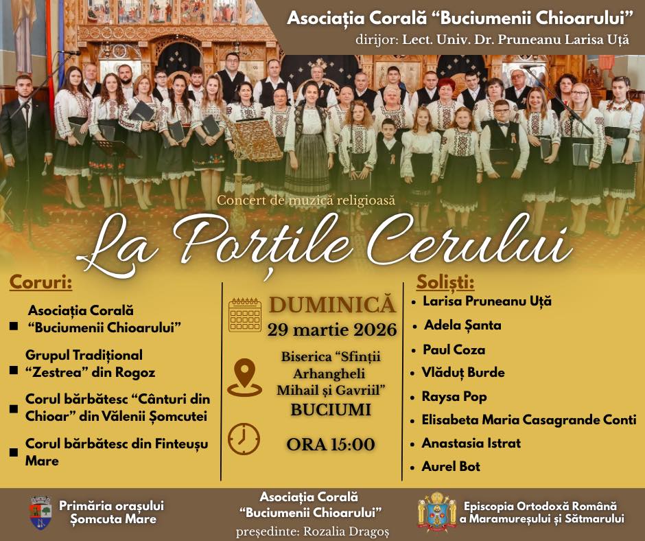 Asociația Corală „Buciumenii Chioarului”, sub conducerea dirijorului Lect. Univ. Dr. Larisa Pruneanu Uță, organizează azi, 29 martie, concertul de muzică religioasă intitulat „La Porțile Cerului”. Evenimentul va avea loc începând cu ora 15:00, la Biserica „Sfinții Arhangheli Mihail și Gavril” din Buciumi.