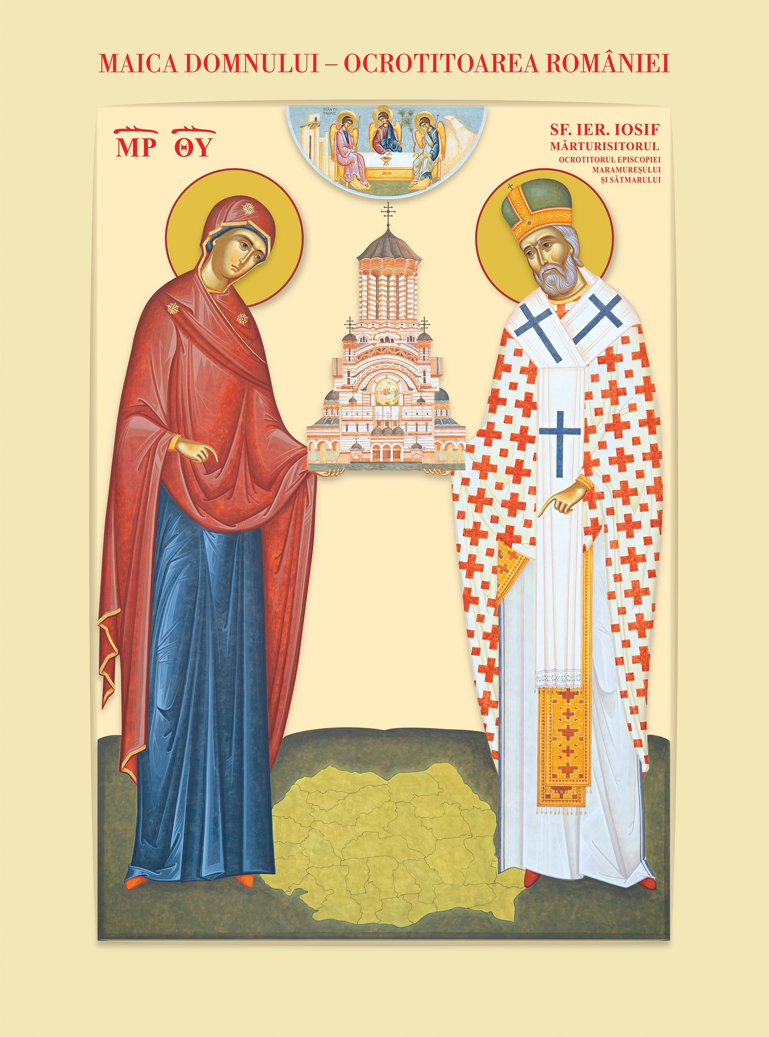 În icoană sunt reprezentați Maica Domnului, Ocrotitoarea României și Sfântul Ierarh Iosif Mărturisitorul, ocrotitorul Episcopiei Ortodoxe Române a Maramureșului și Sătmarului, care țin în mâini Catedrală Episcopală „Sfânta Treime” din Baia Mare; deasupra este zugrăvită Preasfânta Treime, iar la picioare se află harta României.