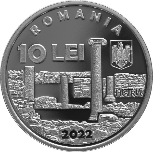 Aversul monedei redă o imagine a ruinelor orașului antic Histria și inscripția ,,HISTRIA”, inscripția în arc de cerc „ROMANIA”, valoarea nominală „10 LEI”, stema României și anul de emisiune „2022”.