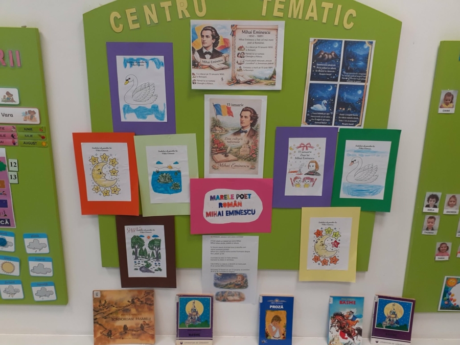În cadrul activității „Eminescu – poetul copilăriei”, organizată de Filiala „Nicolae Iorga” a Bibliotecii Județene „Petre Dulfu” Baia Mare, micuții au realizat, în sala de grupă, o expoziție tematică a creațiilor artistice proprii și au recitat poezii specifice vârstei lor.