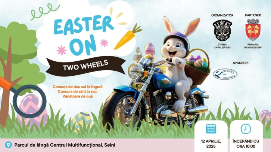 În vederea întâmpinării Paștelui, Zynir’s Cavaliers R.C. organizează evenimentul dedicat copiilor „Easter On Two Wheels”. Acesta va avea loc sâmbătă, 12 aprilie de la ora 10:00, în parcul de lângă Centrul Multifuncțional, Str. 22 decembrie nr.40, Seini.