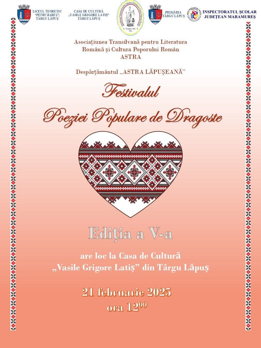 „Astra Lapușeană, Casa de Cultură „Vasile Grigore Latiș” și Liceul Teoretic „Petru Rareș” Târgu Lăpuș vă invită să participați la Festivalul „Poeziei Populare de Dragoste”, un proiect educațional dedicat promovării și valorificării literaturii populare românești.