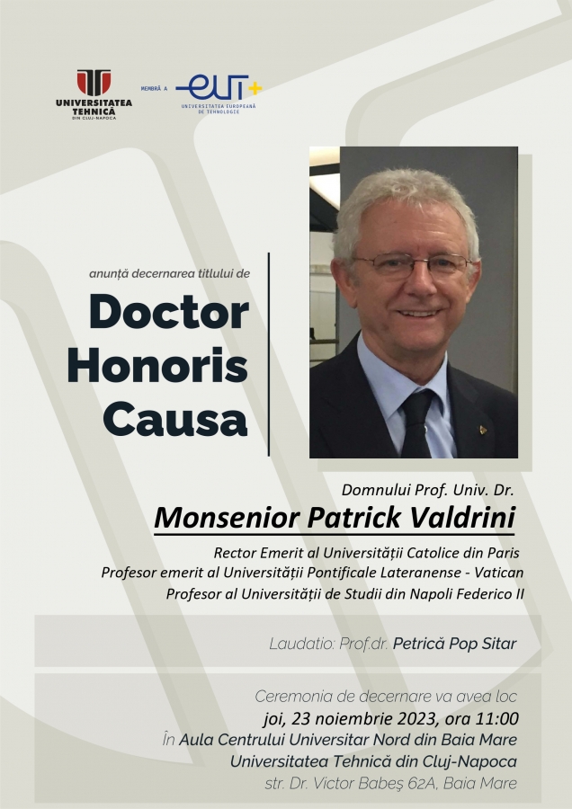 Prof. univ. dr. Monsenior Patrick Valdrini va primi titlul de Doctor Honoris Causa. Acesta este rector emerit al Universității Catolice din Paris, profesor emerit al Universității Pontificale Lateranese – Vatican, dar și profesor al Universității de Studii din Napoli Federico II.