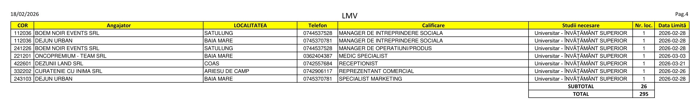 Aproape 300 de locuri de muncă sunt disponibile în aceste zile pe listele AJOFM Maramureș. Oferta e variată, se caută de la barmani, tâmplari și instalatori până la asistenți sociali, programatori de producție și economiști. Listele le puteți consulta mai jos.