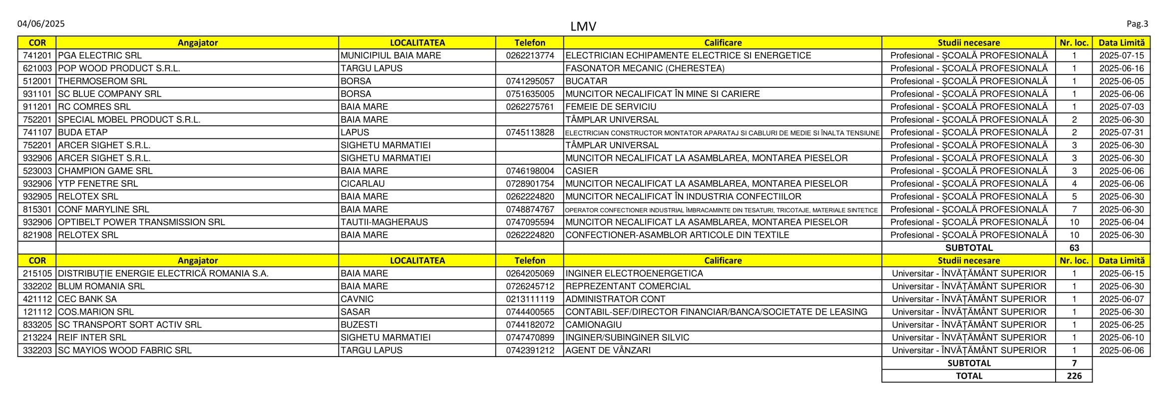 226 de locuri de muncă se regăsesc în aceste zile pe listele AJOFM Mramureș. Se caută de la frizeri, sudori și agenți de vânzări până la designeri de pagini web, ingineri și economiști. Listele le puteți consulta mai jos.