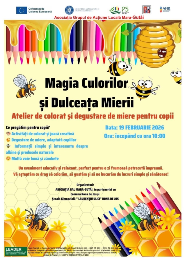 Primăria comunei Rona de Jos, Asociația „Grupul de Acţiune Locală Mara-Gutâi” și Școala Gimnazială „Laurențiu Ulici” organizează, în data de 19 februarie de la ora 10:00, evenimentul „Magia Culorilor și Dulceața Mierii” dedicat copiilor din comuna Rona de Jos.