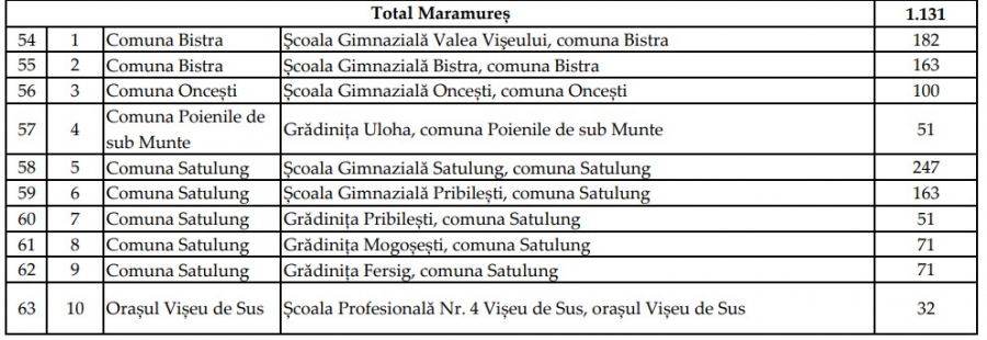 Maramureșul primește 1.131 mii lei, iar unitățile de învățământ în care se vor face amenajări sunt: