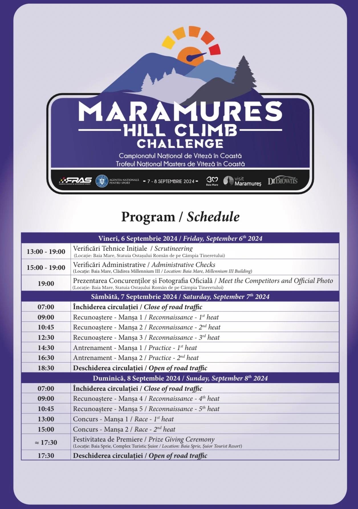 „Etapa a 8-a din cadrul Trofeului Național Masters de Viteză în Coastă, organizat de Clubul Sportiv Dr. Brown’s. 7-8 SEPTEMBRIE – Salvează data și vino să trăiești o experiență unică de motorsport în Maramureș, pe faimosul traseu de pe Gutin! Găsești mai jos programul complet al weekendului”, precizează organizatorii.