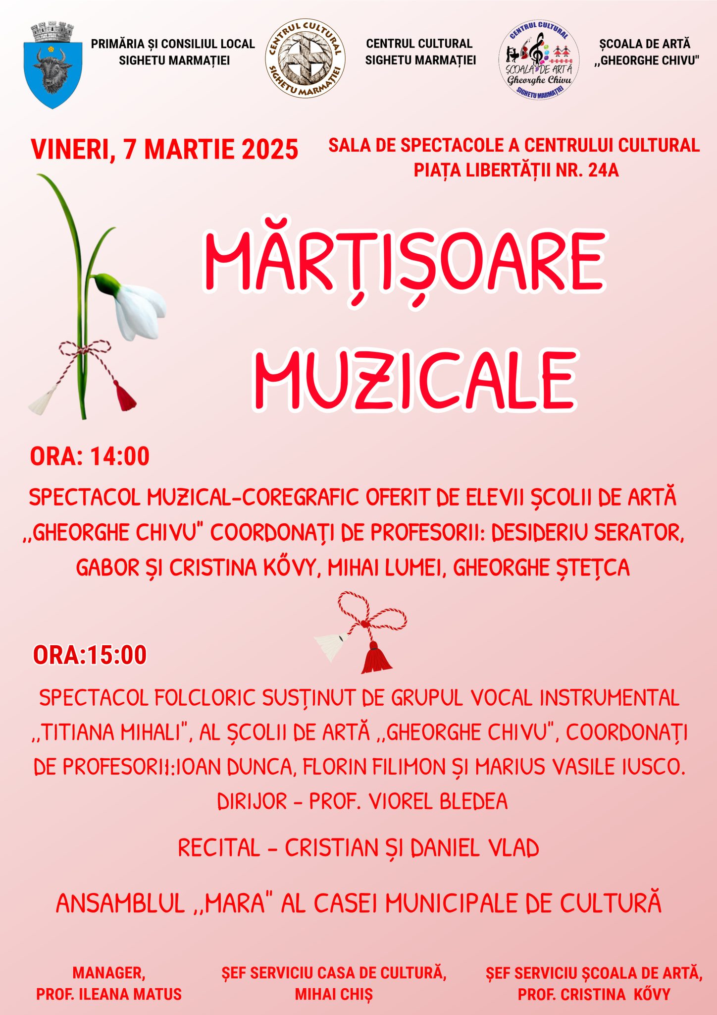 Azi, 7 martie, Sala de Spectacole a Centrului Cultural din Sighetu Marmației va găzdui evenimentul „Mărțișoare muzicale”.