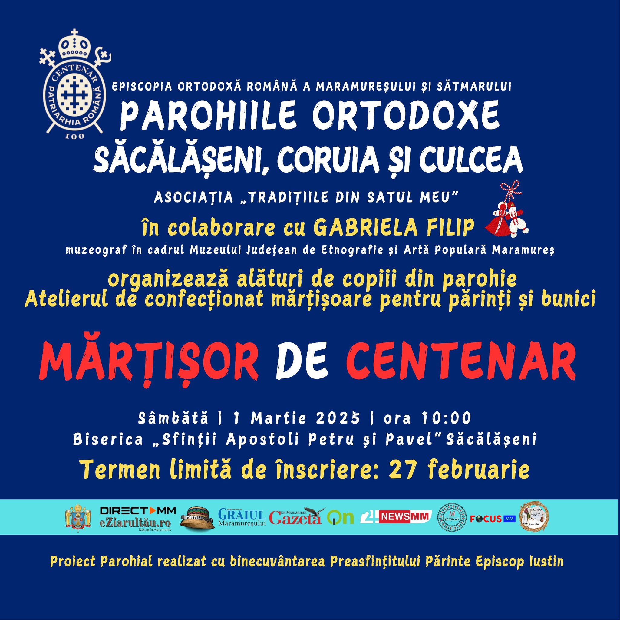 Cu binecuvântarea Preasfințitului Părinte Episcop Iustin, sâmbătă, 1 martie, cu începere de la ora 10:00, Parohia Ortodoxă Săcălășeni, în parteneriat cu Parohiile Coruia și Culcea și Asociația „Tradițiile din Satul Meu”, organizează atelierul de confecționat mărțișoare, intitulat „Mărțișor de Centenar”.