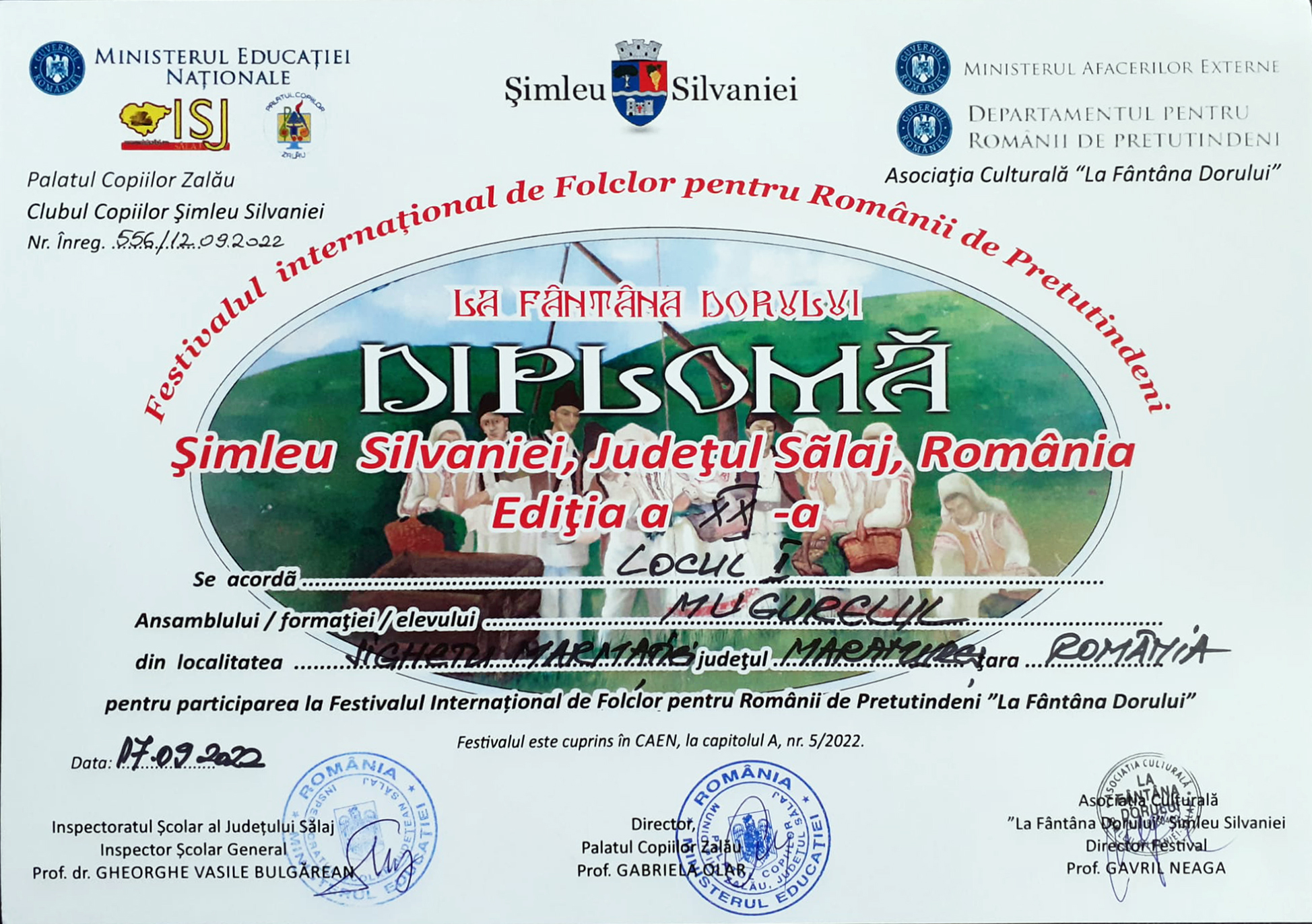 „O nouă recunoaștere a meritelor ansamblului folcloric „Mugurelul” al Clubului Copiilor Sighetu Marmației care a participat în perioada 16-19 septembrie 2022 la Festivalul Internațional de Folclor „La Fântâna Dorului” de la Șimleul Silvaniei organizat de Clubul Copiilor Șimleul Silvaniei și Asociația Culturală „La Fântâna Dorului” cu spijinul Primăriei și Consiliului Local Șimleul Silvaniei, sub patronajul Ministerului Educației și al Ministerului de Externe, Departamentul pentru Românii de Pretutindeni. Mulțumiri pe această cale organizatorilor festivalului pentru aprecieri! De asemenea, mulțumiri membrilor ansamblului, partenerilor și părinților implicați în reușitele activităților extrașcolare ale Clubului Copiilor Sighetu Marmației”, arată acum reprezentanții Clubului Copiilor Sighetu Marmației.