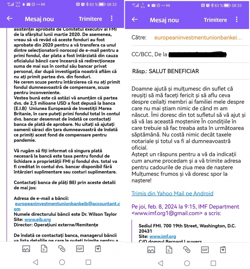 norocoși de e-mail pentru a primi fondul, dar plata a fost întârziată din cauza oficialului băncii car încearcă să redirecționeze suma de mai sus în contul său bancar prvat personal, dar după investigația noastră aflăm că nu ați primit partea dvs. Din fonduri. Vestea bună e că astăzi vă anunțăm că partea dvs. De 2,5 miloaane deUSD a fost depusă la banca (E.I.B.) Uniunea Ruropeană de Investiții Marea Britanie, în care puteți primi fondul total în contul dvs bancar desemnat de îndată ce contactați banca de plată de aprobare”, scie într-o română aproximativă mail-ul în mail.