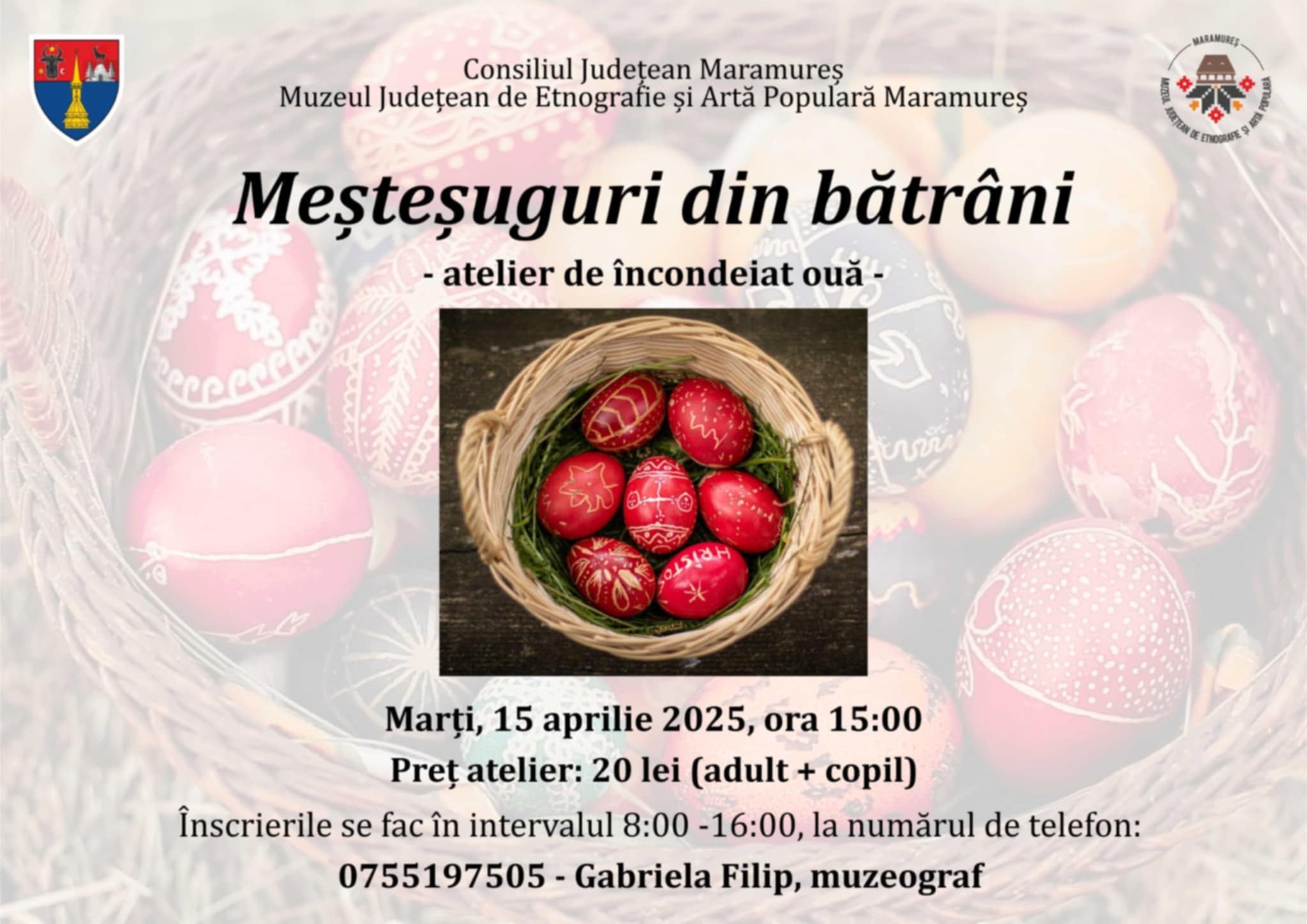 „Dragi copii, tineri, părinți și bunici, marți, 15 aprilie, începând cu ora 15:00, vă invităm să participați la activitatea noastră, intitulată sugestiv „Meșteșuguri din bătrâni – atelier de încondeiat ouă”, organizată după rânduială, în Săptămâna Mare.