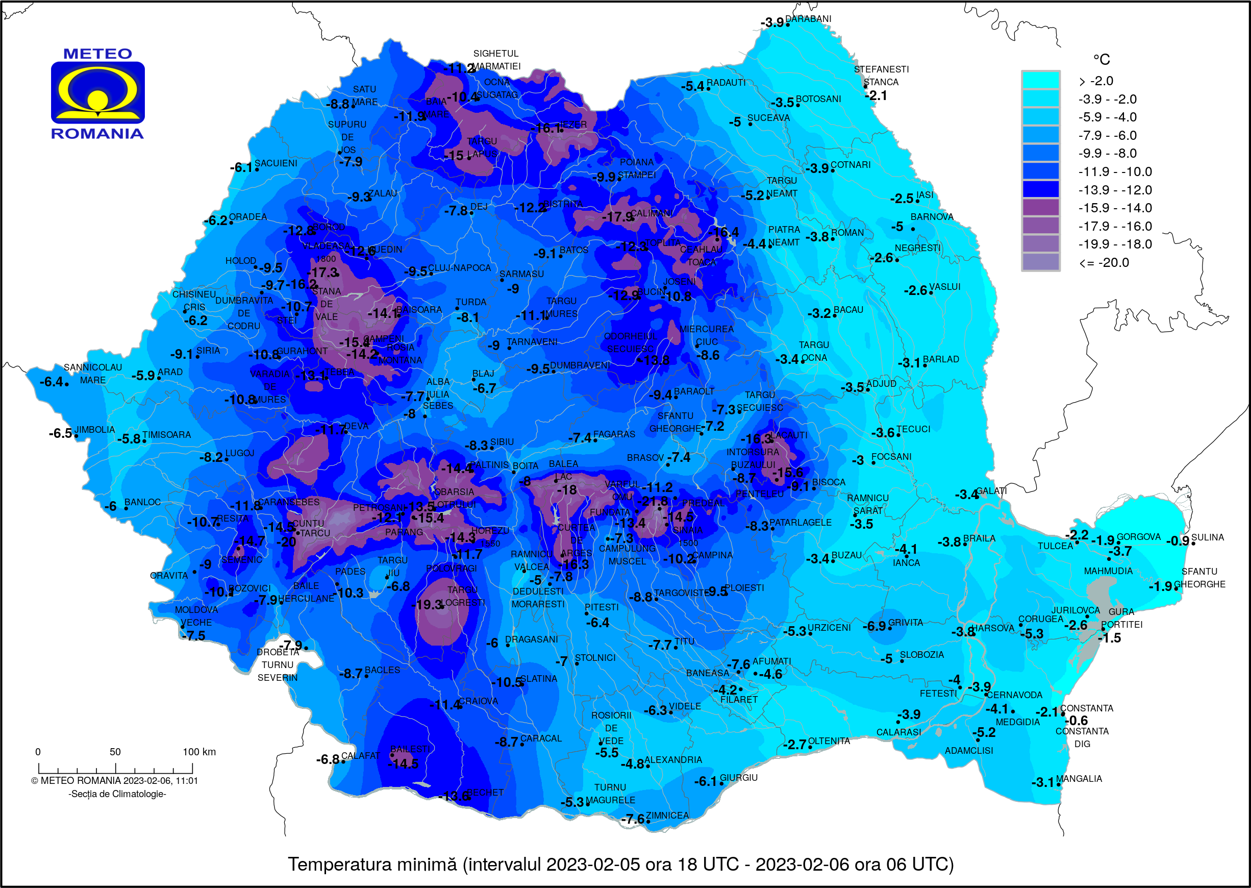 Stratul de zapada masura 48 cm la statia meteo Iezer, 36 cm la Cavnic, 30 cm in Pasul Gutai, 24 cm la Baiut, 22 cm Grosii Tiblesului, 19 cm la Firiza, 17 cm Poiana Borsa Valea Vaserului si Baia Borsa, 16 cm la Moisei, 7 cm la Sighetu Marmatiei, 6 cm la Targu Lapus si Ocna Sugatag, 5 cm in Baia Mare. Temperatura aerului inregistreaza urmatoarele valori: -16 grade la statia meteo Iezer, -15 grade in Targu Lapus, -11 grade in Baia Mare, la Sighetu Marmatiei si in Pasul Prislop, -10 grade la Cavnic, -9 grade la Ocna Sugatag, -8 grade la Borsa. Temperatura resimtita cea mai scazuta este pentru a doua noapte consecutiva de -20 grade la statia meteo Iezer, iar indicele de racire a ajuns la -27, chiar -30. Sa mentionam ca recordul iernii, pana acum, este cel din noaptea de 4 spre 5 februarie, -18 grade la statia meteo Iezer, mult sub recordul din 2022, -25 grade in Targu Lapus si Petrova, in 25 ianuarie.
