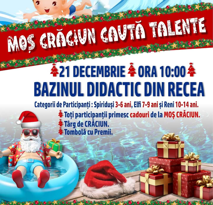 „Moș Crăciun caută talente” pe 21 decembrie, ora 10.00, la Bazinul Didactic de Înot din Recea. Participanții la eveniment sunt: