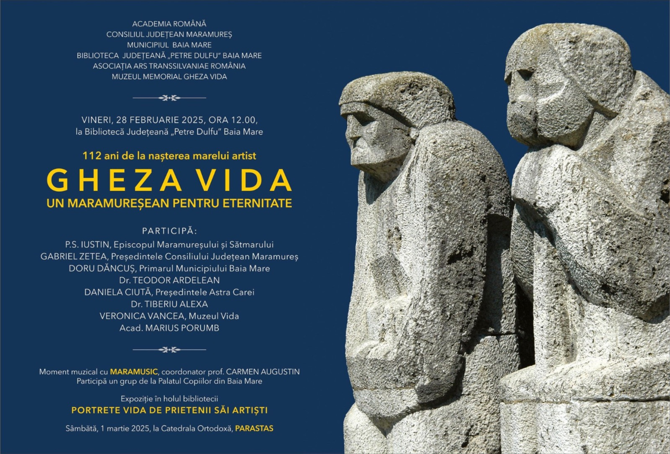 În data de 28 februarie 2025, se împlinesc 112 ani de la nașterea renumitului sculptor Gheza Vida. Cu această ocazie, vineri, 28 februarie, de la ora 12:00, Biblioteca Județeană „Petre Dulfu” din Baia Mare va găzdui un eveniment comemorativ organizat de Muzeul Memorial Gheza Vida, în parteneriat cu Academia Română, Consiliul Județean Maramureș, Primăria Baia Mare și Biblioteca Județeană.