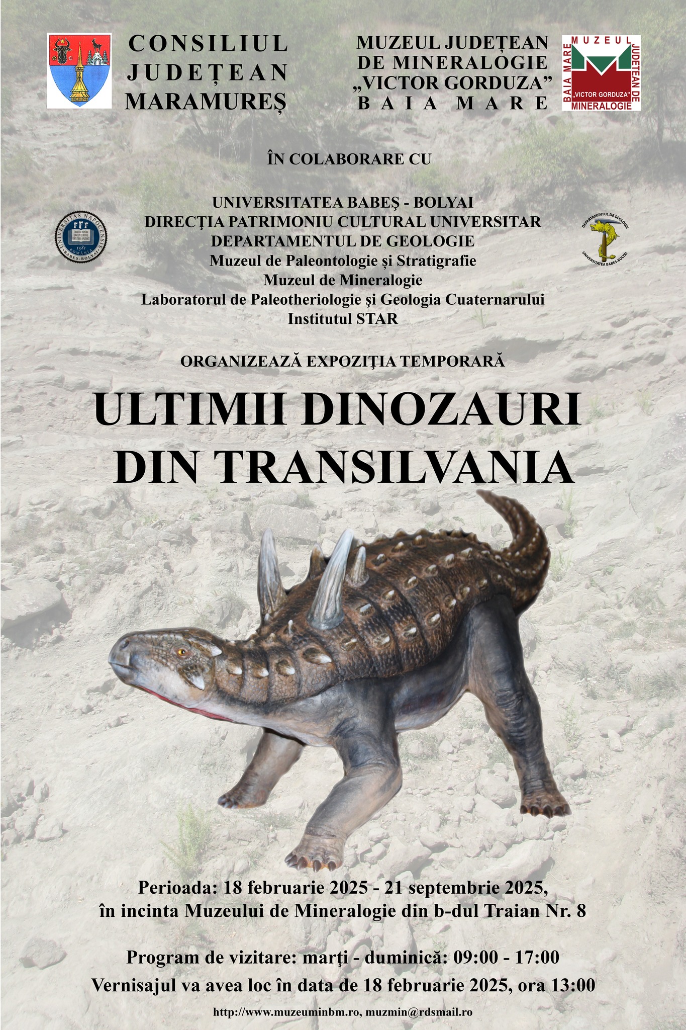 În perioada 18 februarie – 21 septembrie, Muzeul Județean de Mineralogie „Victor Gorduza” Baia Mare va găzdui expoziția „Ultimii dinozauri din Transilvania”.
