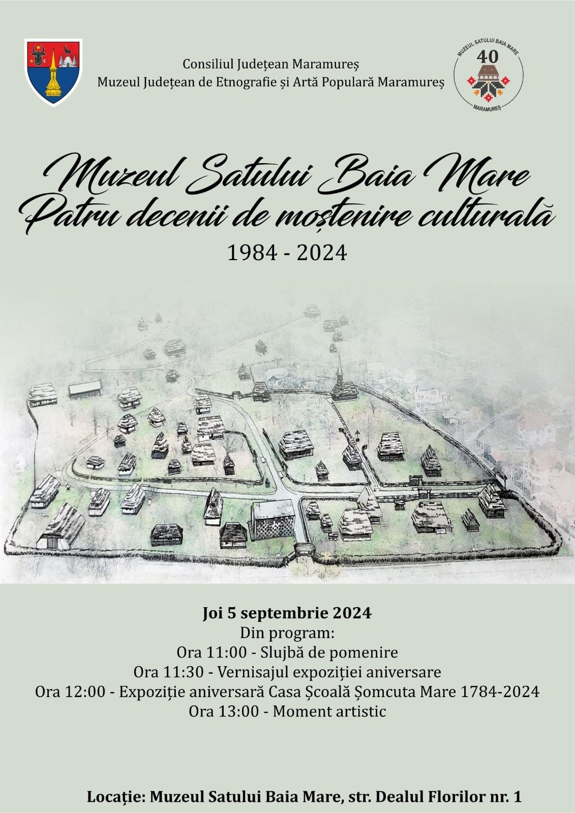 Cu ocazia împlinirii a 40 de ani de la deschiderea expoziției permanente din Muzeul Satului Baia Mare, joi, 5 septembrie, de la ora 11.00, va avea loc vernisajul expoziției aniversare pentru a marca acest moment de mare însemnătate pentru instituția de cultură.