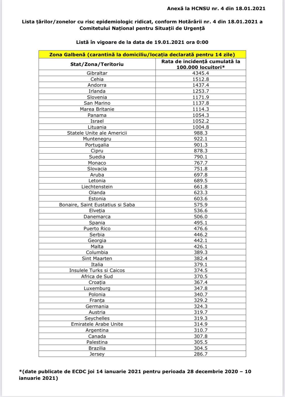 Art.1 – Se aprobă lista țărilor/zonelor/teritoriilor de risc epidemiologic ridicat pentru care se instituie măsura carantinei asupra persoanelor care sosesc în România din acestea, prevăzută în anexa la prezenta.