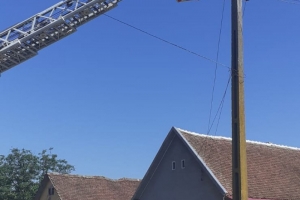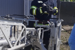 Pompierii din Ineu au salvat trei pui de barză care căzuseră dintr-un cuib. Oamenii au folosit autoscara și au pus puii în cuibul construit de mama lor.