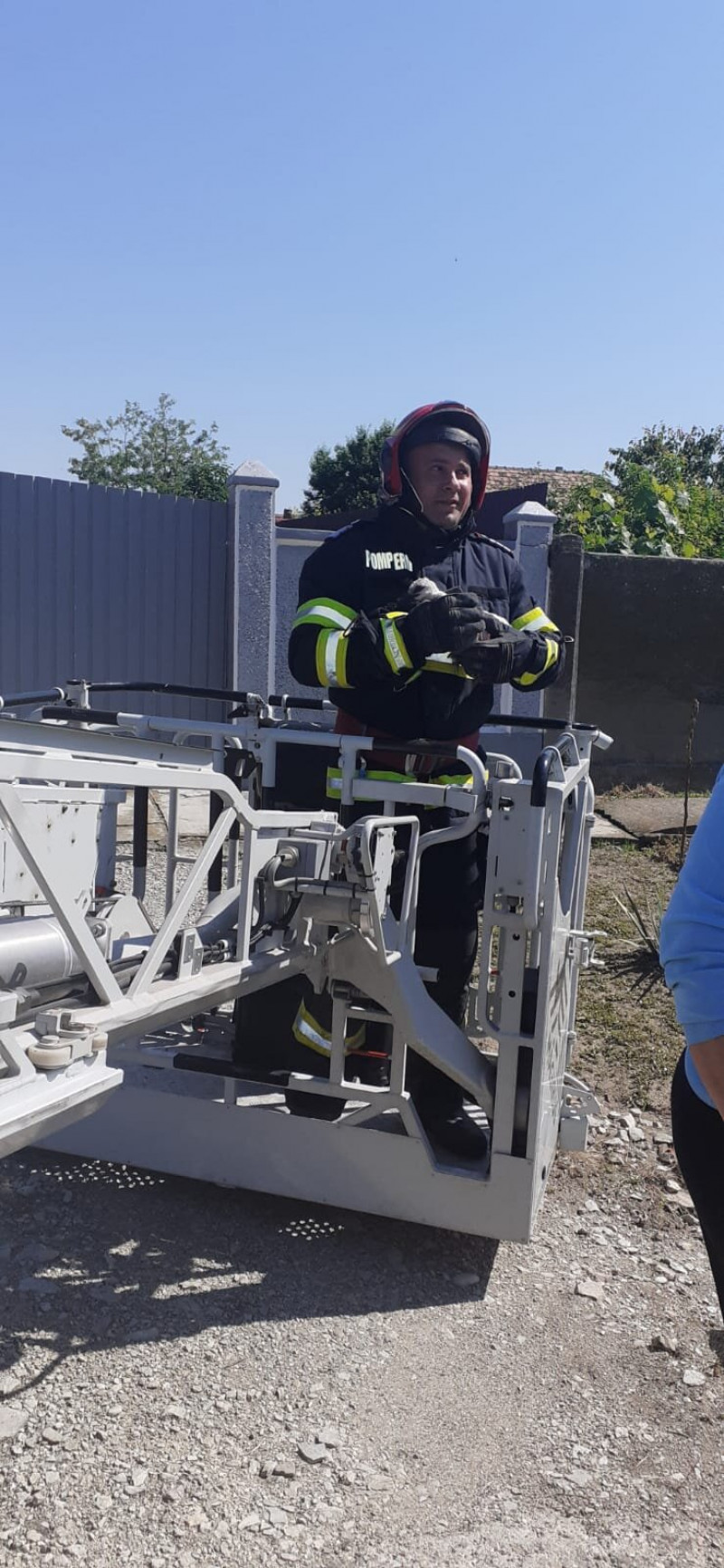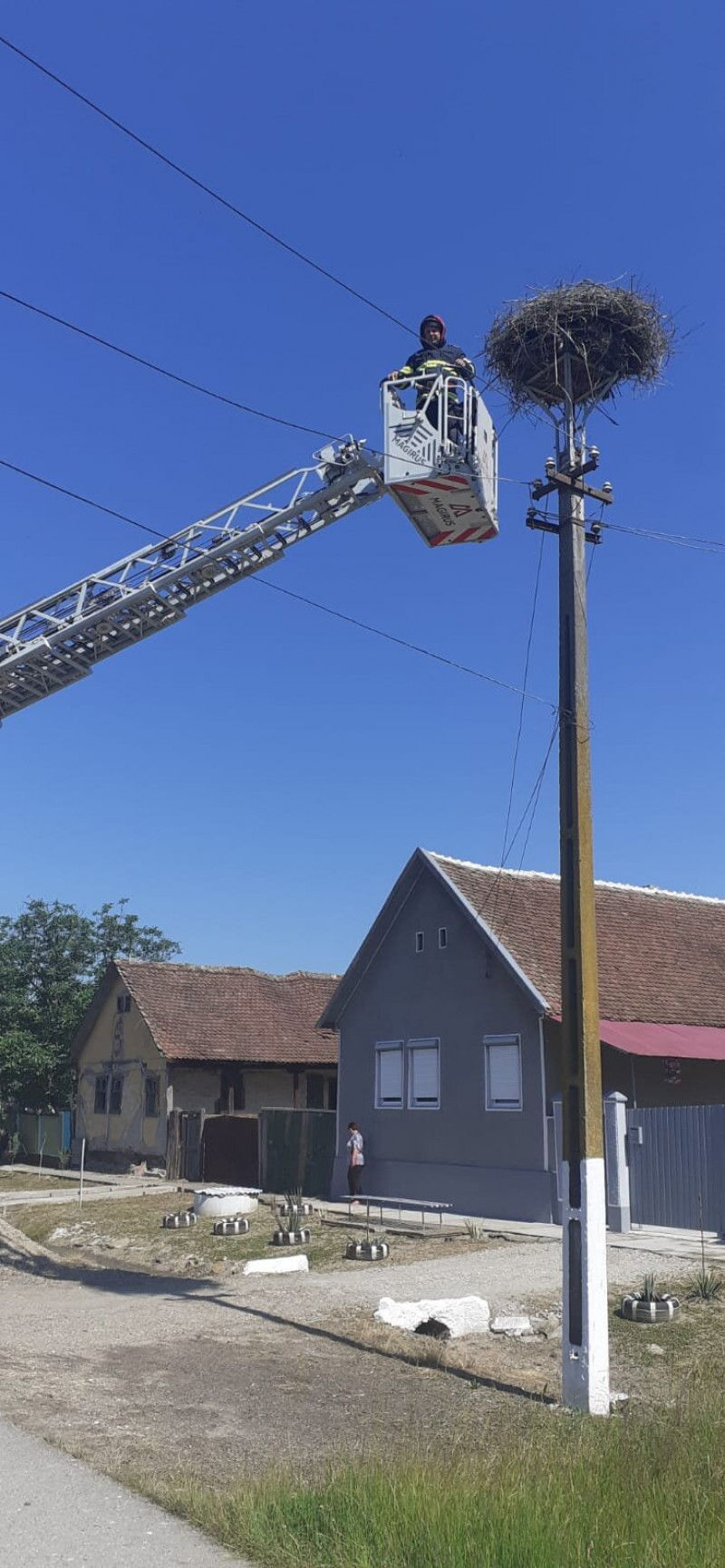 Pompierii din Ineu au salvat trei pui de barză care căzuseră dintr-un cuib. Oamenii au folosit autoscara și au pus puii în cuibul construit de mama lor.