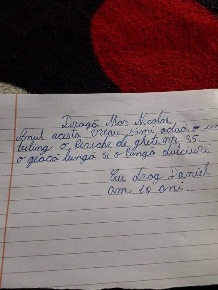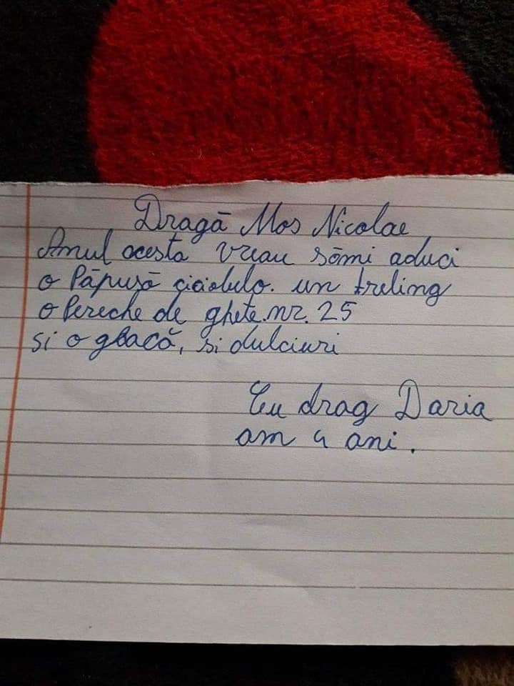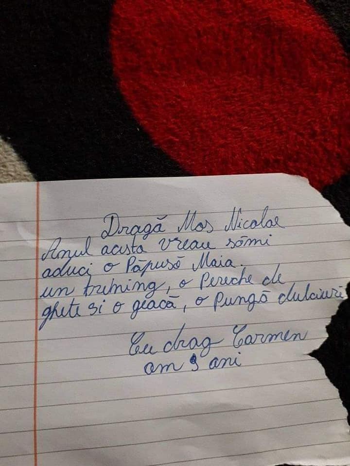 Acestui grup s-au alăturat și alți voluntari cu care împreună am reușit să aducem o clipă de fericire pe chipurile unor familii încercate de soartă, familii ce își doresc cu ardoare a ieși din acel mediu, din care am făcut si eu parte, familii care au înțeles faptul că o școlarizare te poate ridica pe culmile succesului. Prima acțiune pe care am făcut-o pe grupul Facebook ”Helping Hands EUROPA” a fost ACASĂ ESTE COMUNITATEA TA, am reușit să ajutăm 80 de familii cu alimente și bunuri de consum, rechizite școlare și multe altele. A doua acțiune întreprinsă cu ajutorul voluntarilor s-a numit ” MOȘ NICOLAE VINE LA TOȚI COPIII”, o acțiune de succes, spun eu, deoarece am reușit să ajungem să împărțim cadouri la 800 de copii a trei comunități din Baia Mare. În ianuarie 2019 am considerat oportun a ne întoarce la câteva familii greu încercate din campania ACASĂ ESTE COMUNITATEA TA pentru a readuce un impuls acestora. Luna aprilie naște ideea FII IEPURAȘUL UNUI COPIL DE PAȘTE, idee dusă la capăt cu ajutorul voluntarilor prin care s-a reușit împărțirea de dulciuri și alimente unor copii greu încercați de soartă. Tot în acea perioadă, stând de vorbă cu acești copii, am concluzionat dorința acestora de a merge la școală și de a fi tratați ca și copii normali. Așa ia naștere acest proiect intitulat ÎNCURAJĂM ȘCOALA. În primă fază am reușit să strâng 20 de ghiozdane complet echipate și să le ofer acestora. Nu am vrut să mă opresc aici, din contră, am cerut ajutorul mai multor comunități din Diaspora. Îmi doresc ca noi toți împreună să reușim să ajutăm cati mai mulți copii din România, pentru a putea merge la școală și a le aduce un suport ulterior familiilor acestora. Vreau ca acești copii să nu fie lăsați ai nimănui, vreau ca acești copii să nu mai abandoneze școala din diferite motive. AVEM NEVOIE DE HAINE, ÎNCĂLȚĂMINTE, ALIMENTE ȘI DULCIURI! DE CRĂCIUN NE ÎNTOACEM LA TINE. ANDRADA ȘI PRIETENI”, mai arată Andrada Mădălina Toporaș în descrierea poveștii sale emoționante. Așadar adoptă și tu acum o scrisoare! Iată câteva exemple atașate!